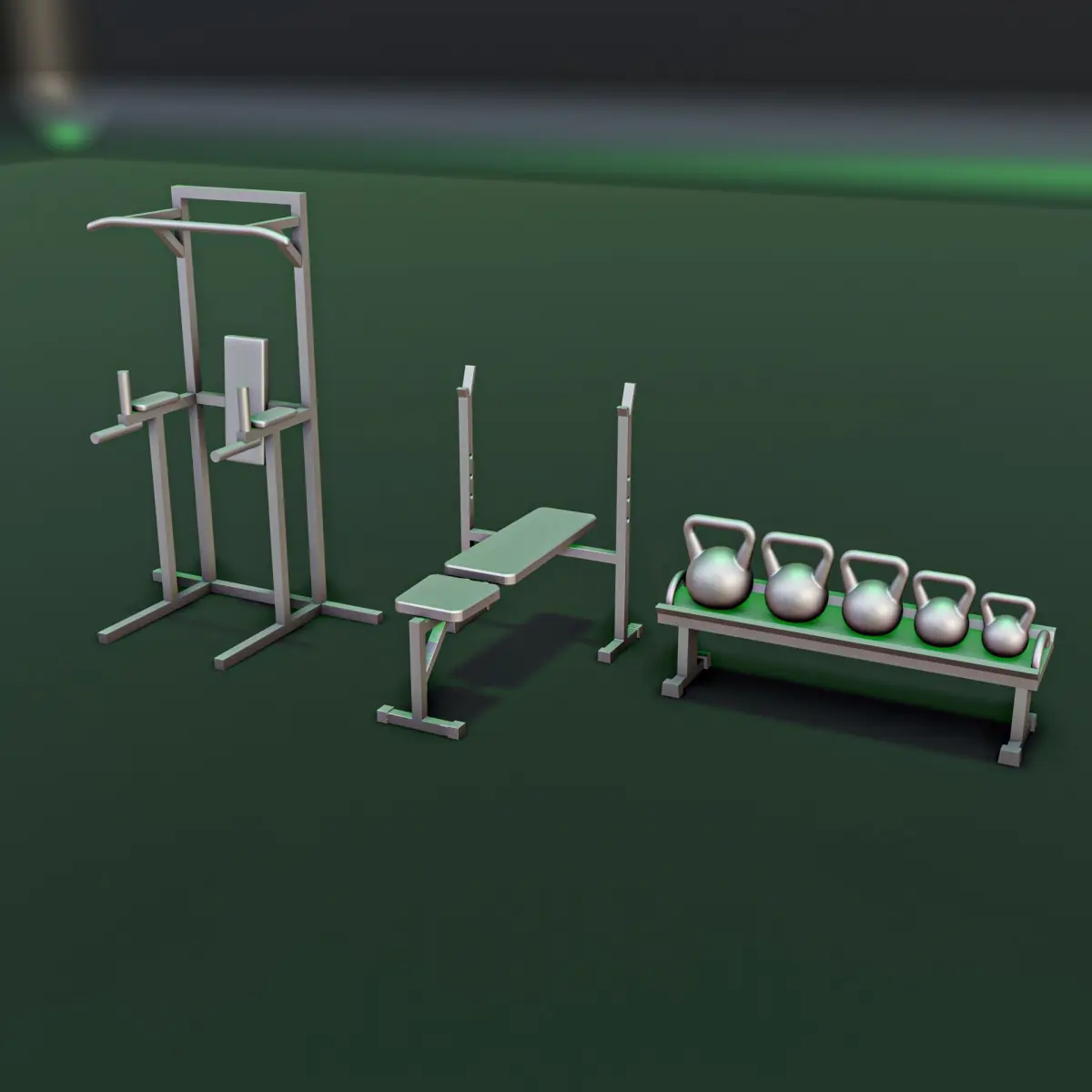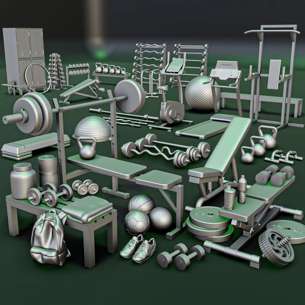 The Pack contains:ab trainer, backpack, balance board, horizontal bar, bar complex, barbell (4 tepes), barbell stand (2 types), bars, basketball, bench (2 types), bench press, sport bottle, water bottle, dumbell (4 types), dumbell stand (2 types), exercise bike, hoop, locker room bench (2 types), locker, mat, press roller, protein, push ups, sneakers, soccer ball, step platform, towels, treadmill, volleyball, vulture (4 types), weight (5 types), weight stand, yoga ball