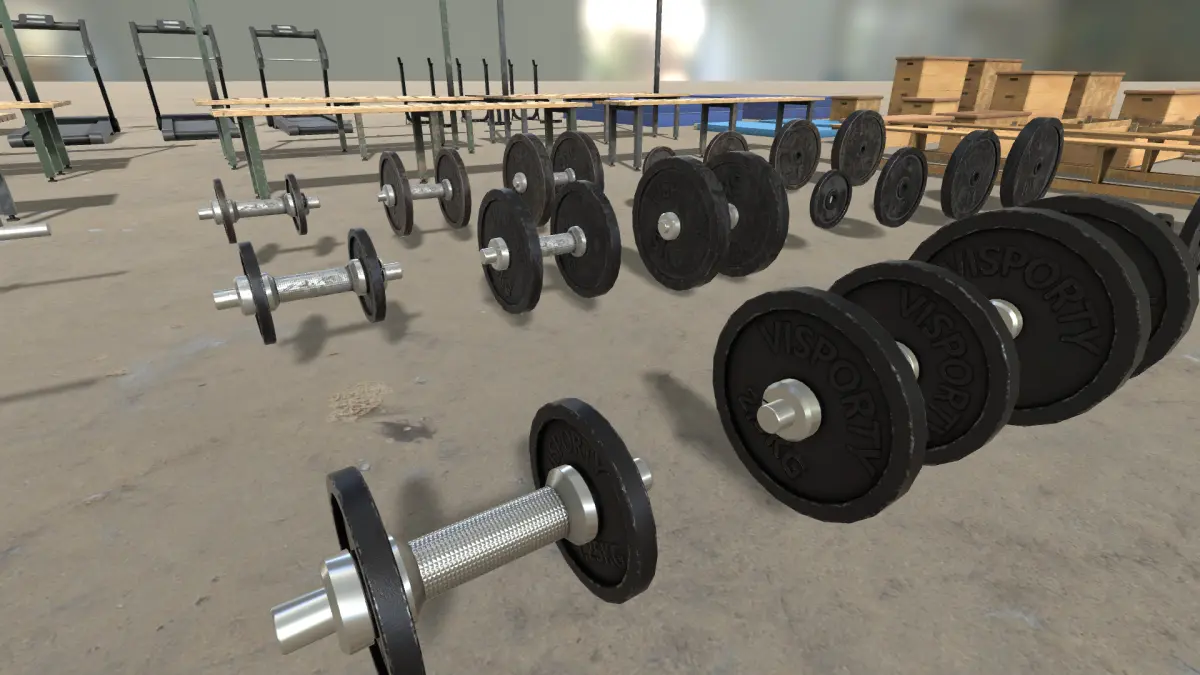 All objects come with with a different dirt levels and some also include different color-texture-sets.The weights and large vaulting boxes are modular.