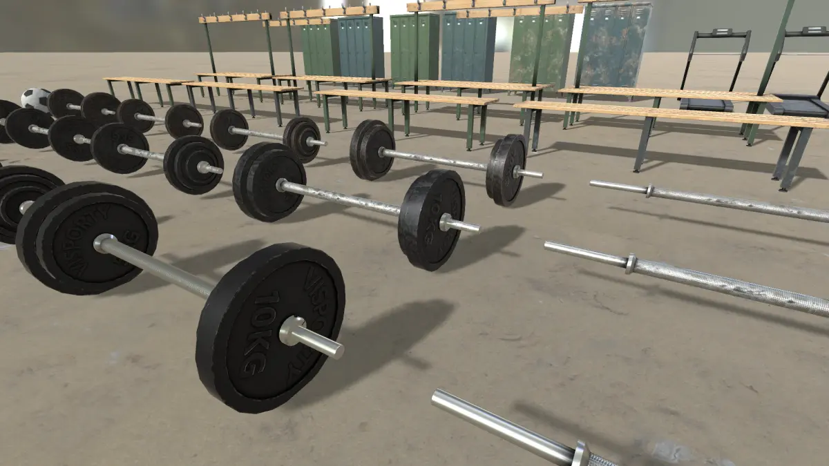 This package contains different gym/sportshall props like lockers, benches, mats, vaulting boxes,weights and more.