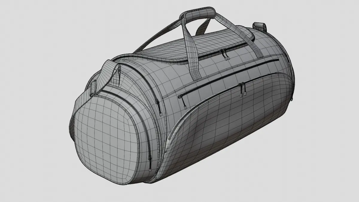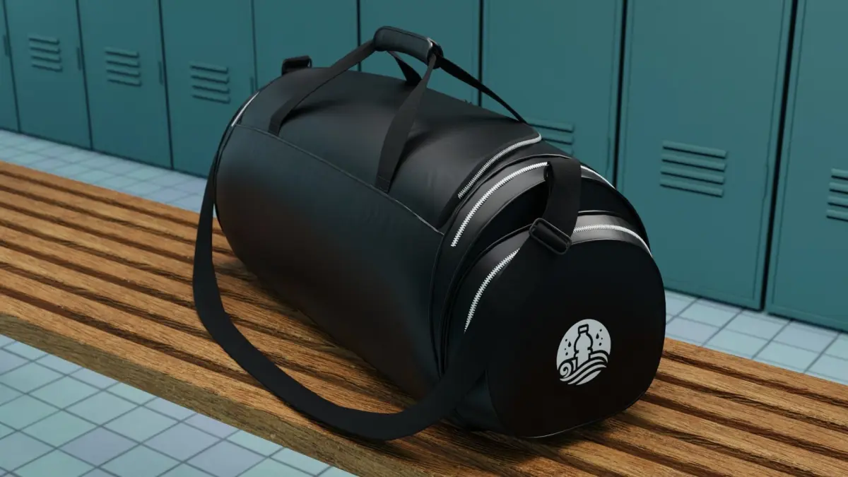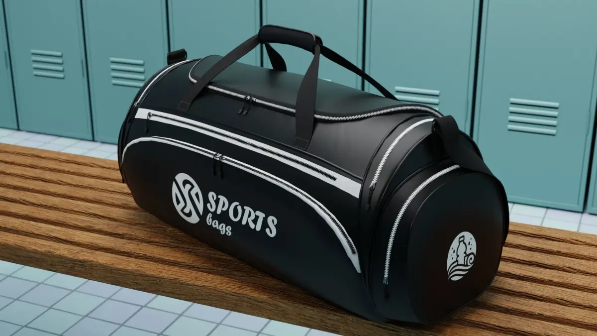 3D low-poly model of a spacious sports bag in a sleek black color. The bag has two side pockets with graphic labels depicting a water bottle and a towel. The adjustable shoulder strap and padded handles make it easy to carry.