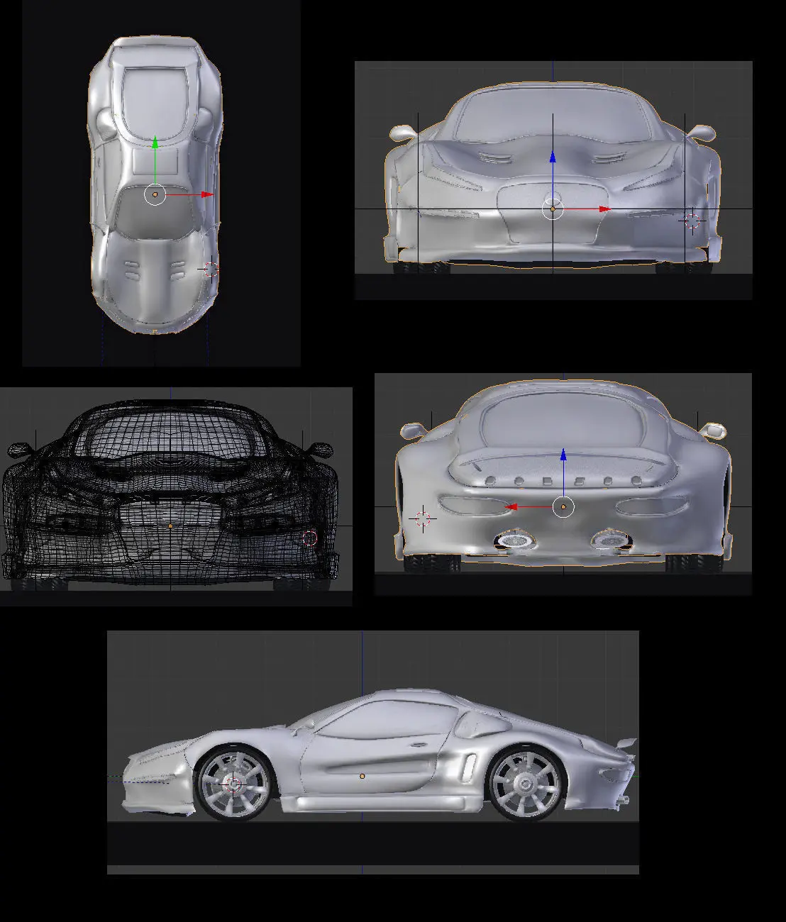 Hood, doors, wheels, and hatch are separate pieces parented to the main body.