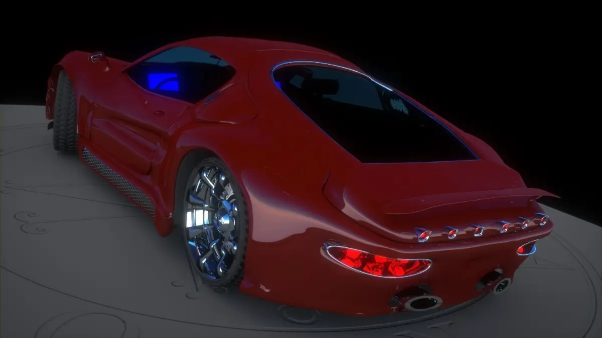 Materials include shaders for paint, illumination, glass, lenses, and faux geometry (using png texture w/ alpha)
