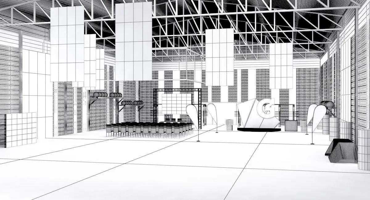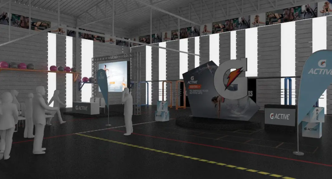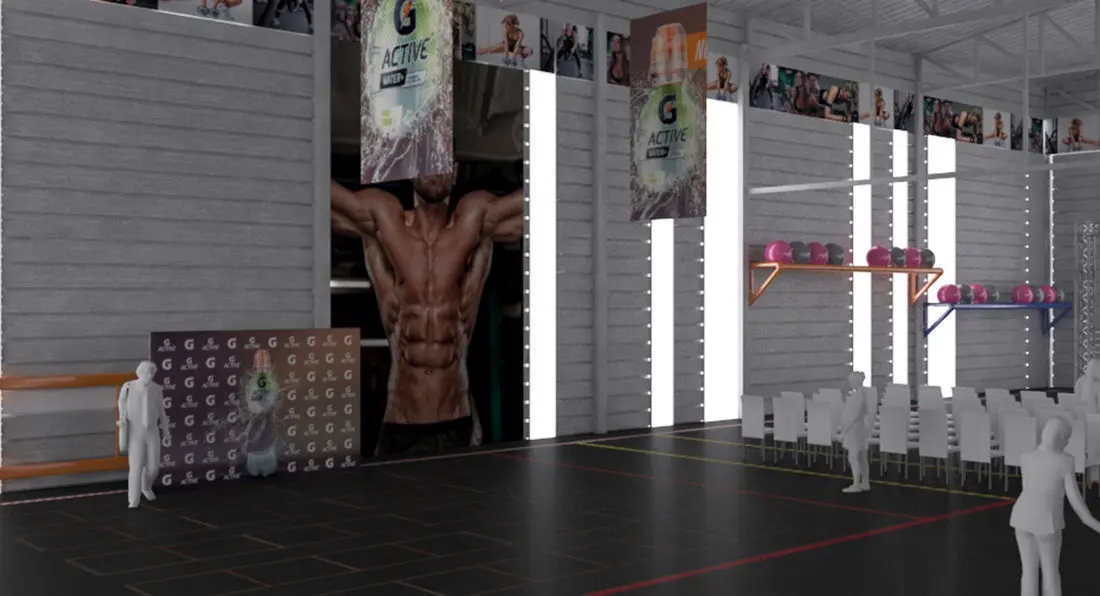 Sports event in Gym, a complete simulation of the environment for the event, with installation of led screens, banners, lights, chairs, stands, sports, banners and modern decoration with areas for running and pilates, press conference area for 100 people