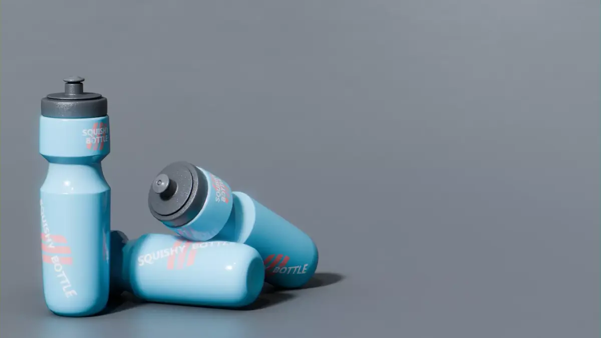 A modern sports squeeze bottle. This style of bottle looks right at home in a gym bag, on an apartment shelf, or in the bottle cage of a mountain bike. Featuring a design based on the universal squeeze bottle format, this accurately represents a 25 ounce (730g/740 ml) athletic bottle.