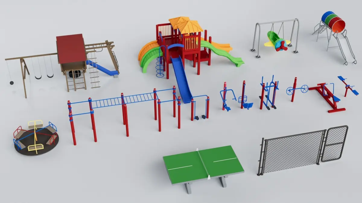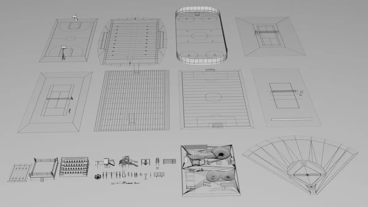 Items(x100):Playground Equipments, Curling Rink, Stadium Seats, Boxing Ring, Fence, Skate Park, Volleyball Court, Ice Hockey Rink, Football Pitch, Badminton Court, Rugby Pitch, Tennis Court, American Football Field, Baseball Field, Basketball Court, Torphy