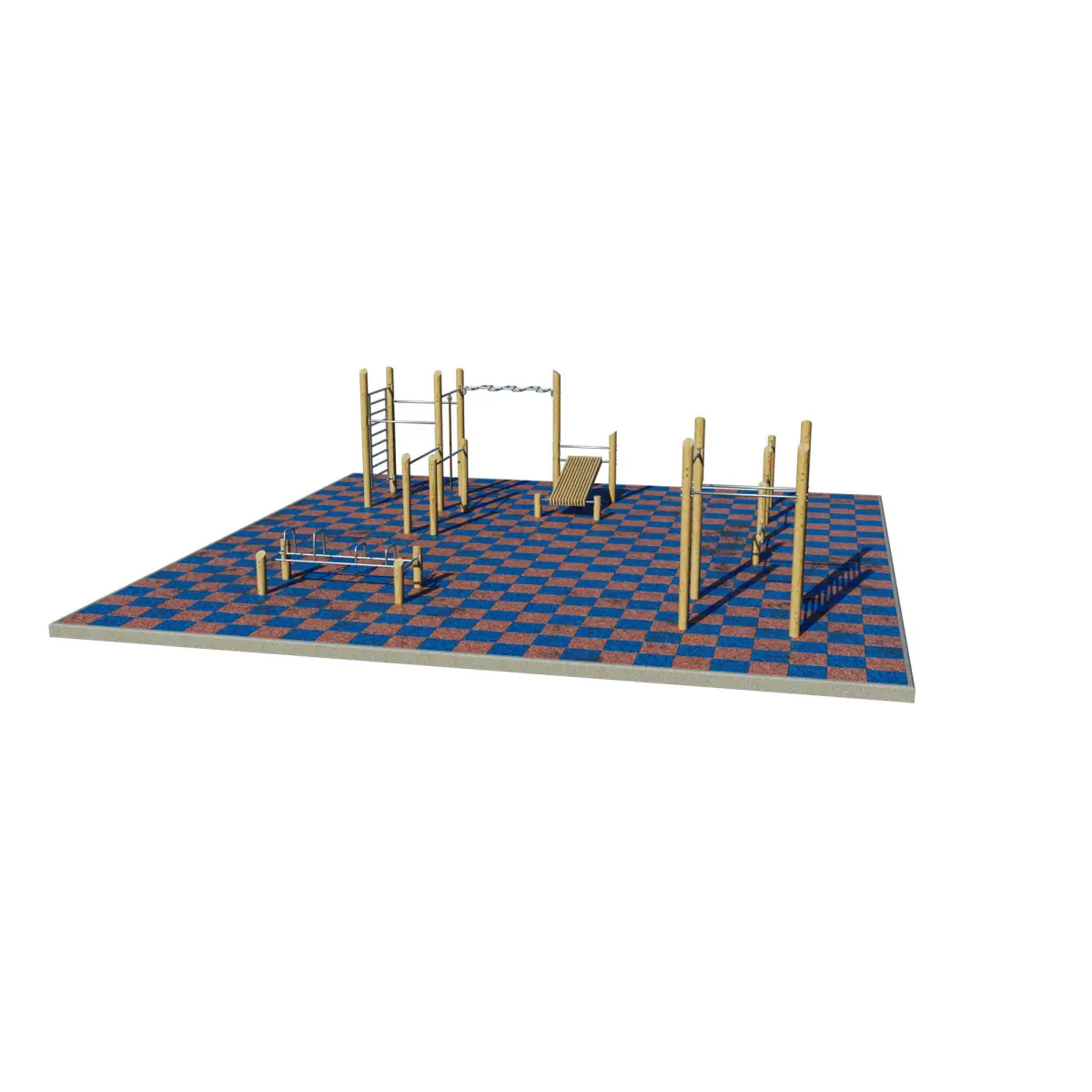Functional sports complex in ECO style for working with own weight on the surface made of pressed rubber crumb.The playground is equipped with: