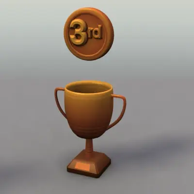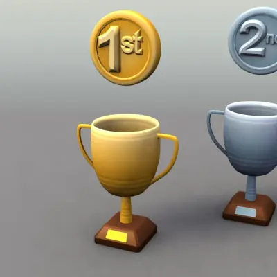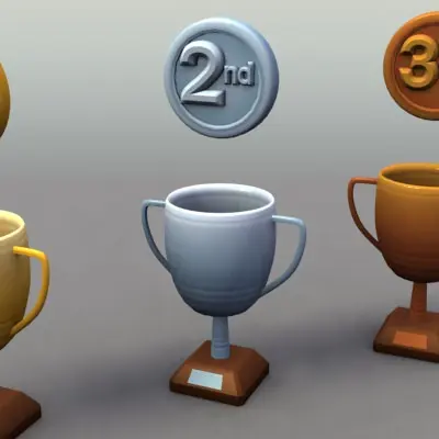 3 Trophy/Cup models - gold, silver and bronze, along with medals.