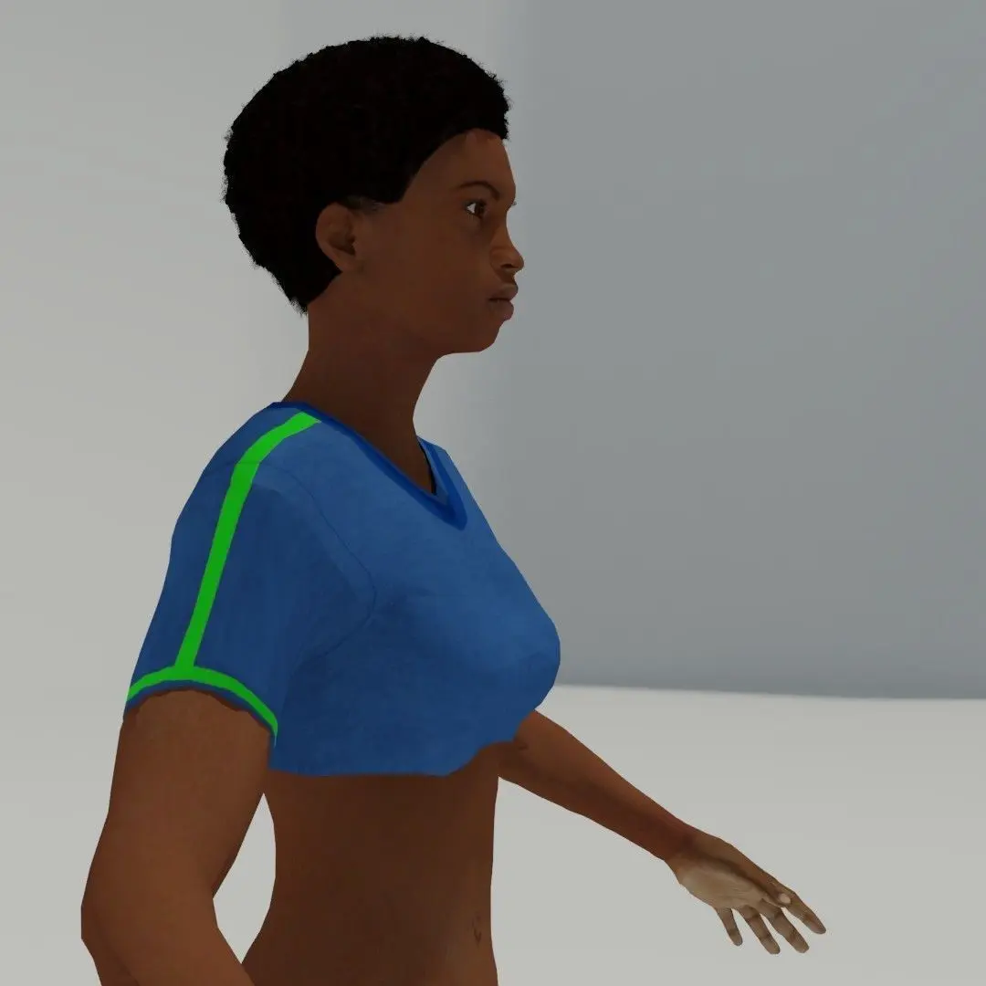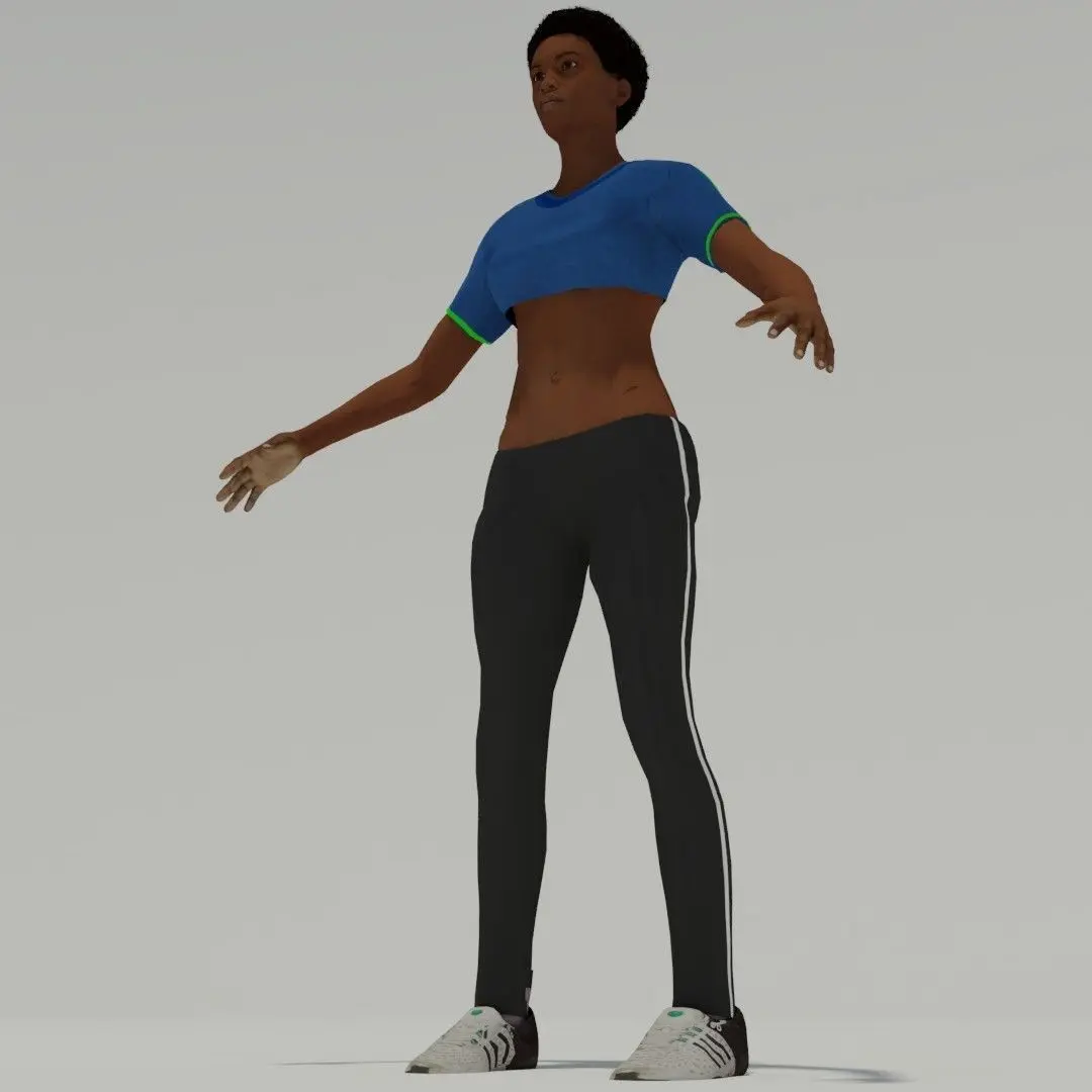 SportsWoman with blue top, black pants and tennis shoes. Height: 1,70m.