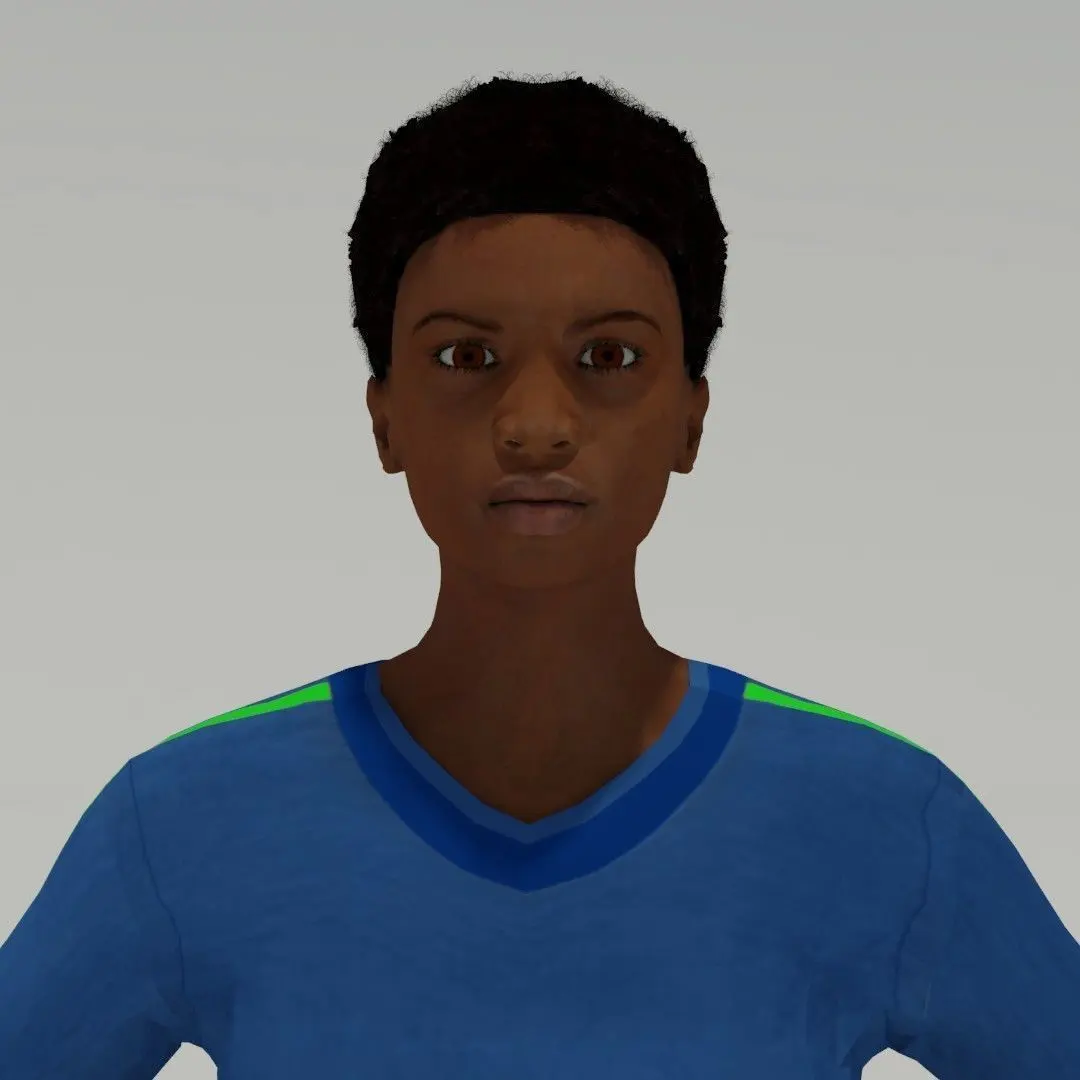 Brown skin and eyes, eyelashes, eyebrow and afro haircut. Mouth modeled with teeth and tongue.