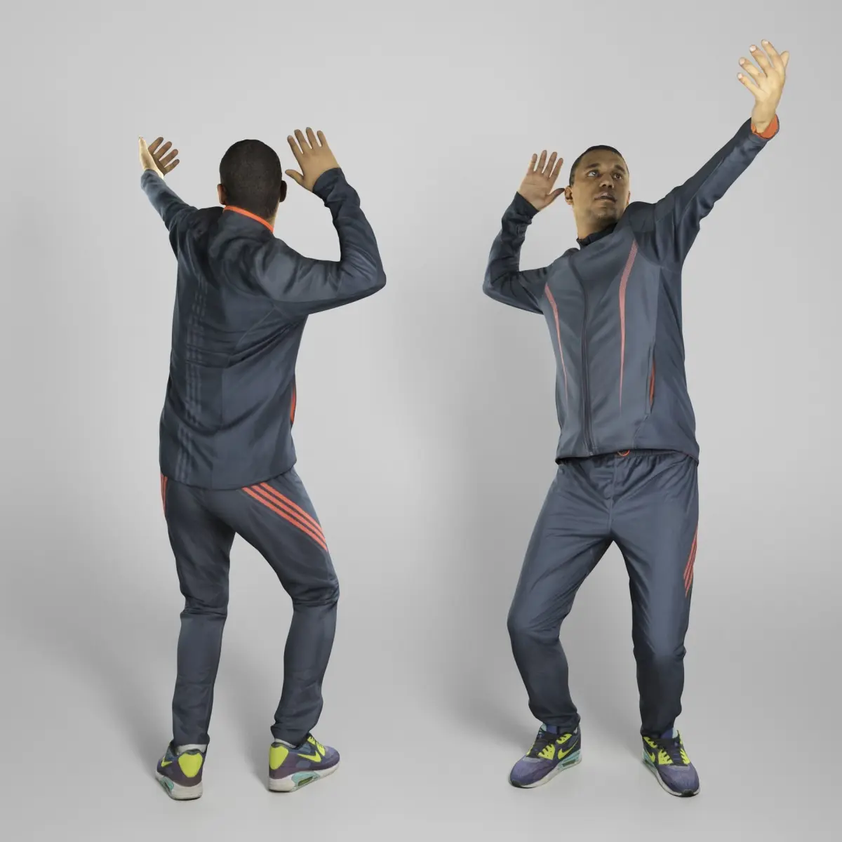 This is a true human size and detailed model of a sporty handsome young man of African appearance. The model is captured in casual pose to be perfectly matching for variety of architectural visualizations, e.g. beach, jogging track, gym, park, VR/AR content, etc.