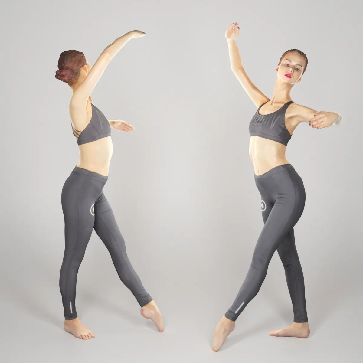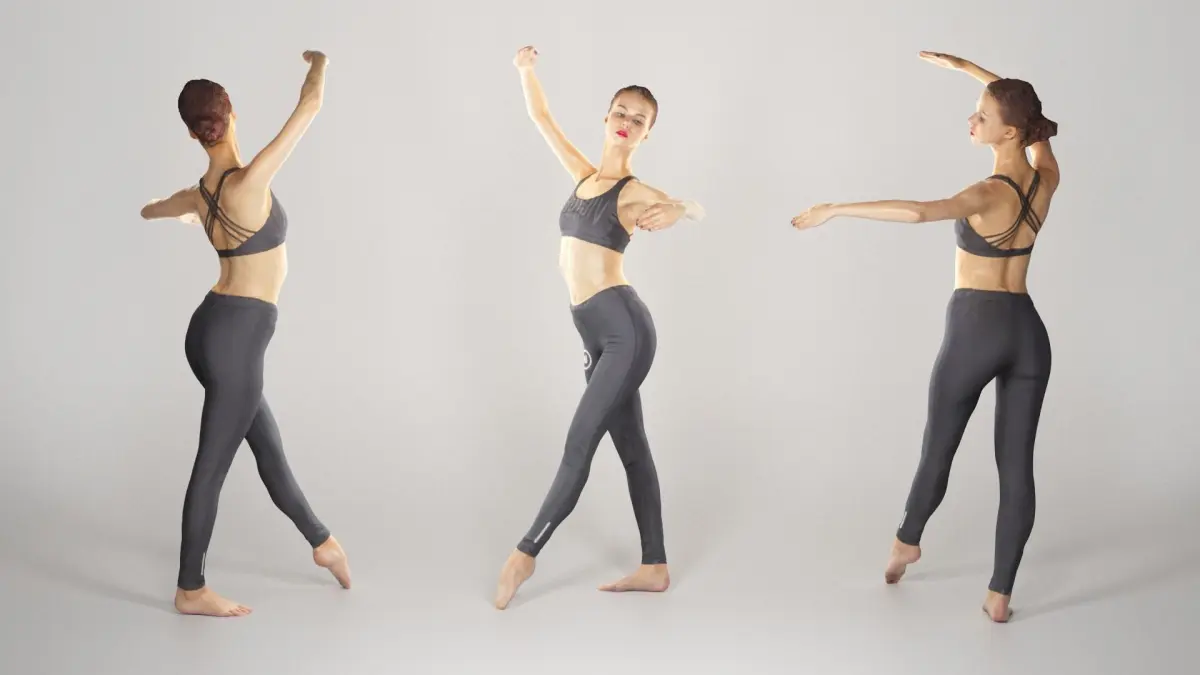 This is a true human size and detailed model of a sporty beautiful young woman of Caucasian appearance. The model is captured in casual pose to be perfectly matching for variety of architectural visualizations, e.g. dance studio, sport ground, gym, beach, etc .