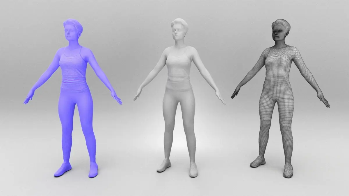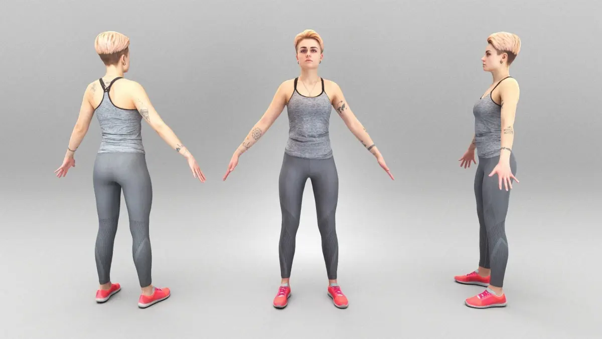 This is a true human size detailed model of a beautiful young woman of Caucasian appearance dressed in sportswear. The model is captured in the A-pose with mesh ready for rigging and animation in all most usable 3d software.