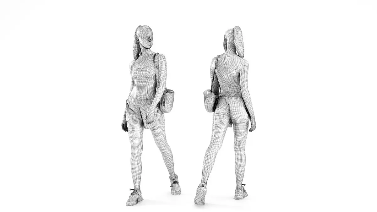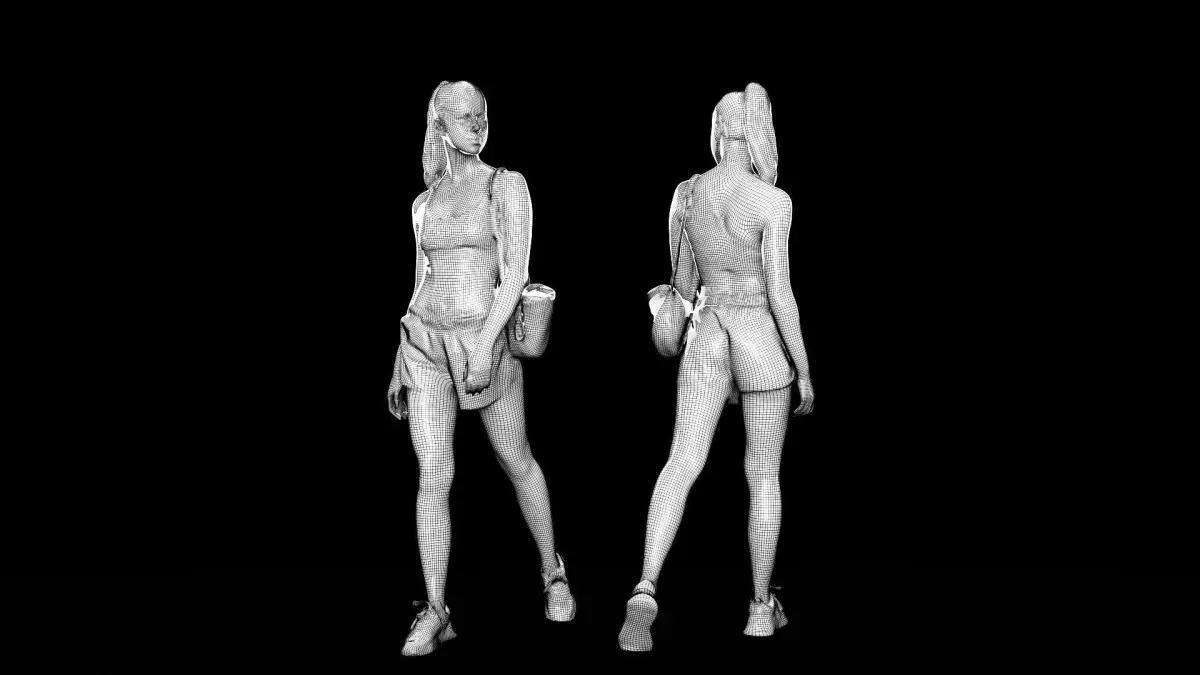 This is a true human size and detailed model of a sporty beautiful young woman of Caucasian appearance. The model is captured in casual pose to be perfectly matching for variety of architectural visualizations, e.g. sport ground, gym, beach, etc.