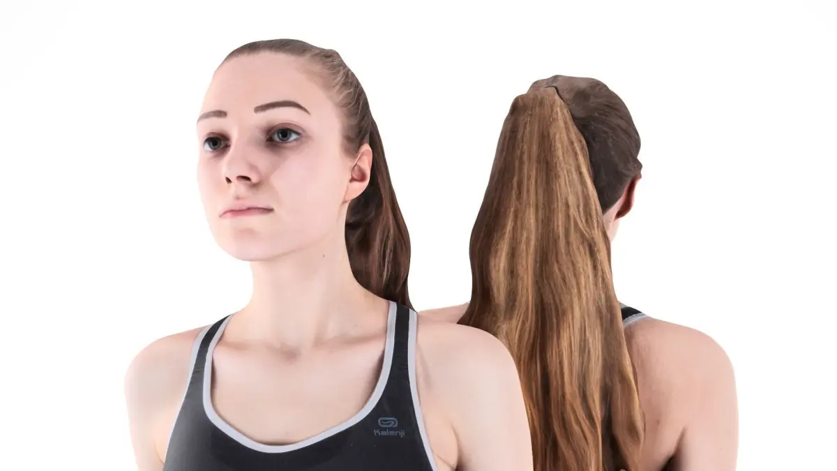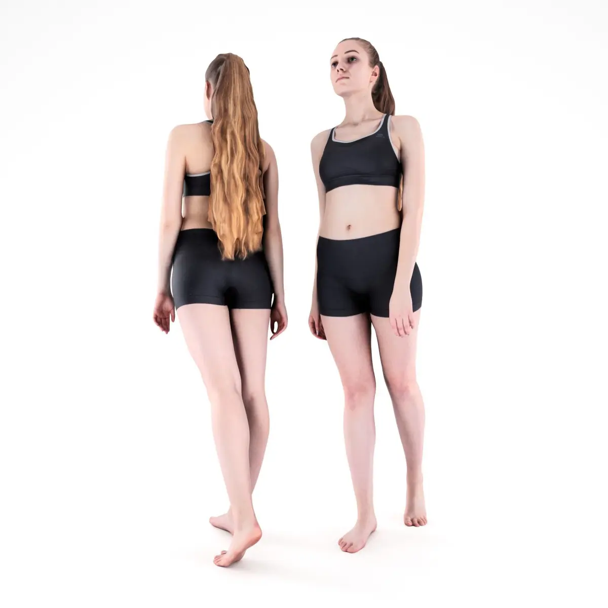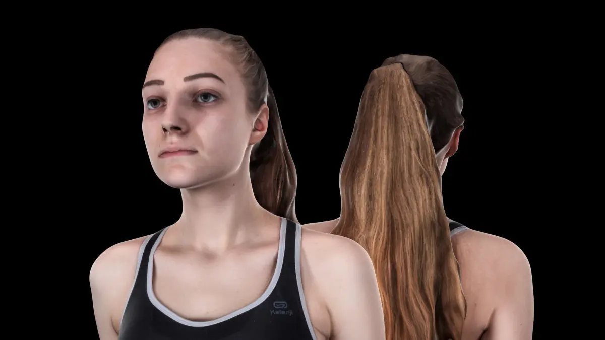 This is a true human size and detailed model of a sporty beautiful young woman of Caucasian appearance. The model is captured in casual pose to be perfectly matching for variety of architectural visualizations, e.g. sport ground, gym, beach, etc.