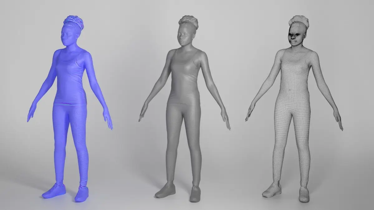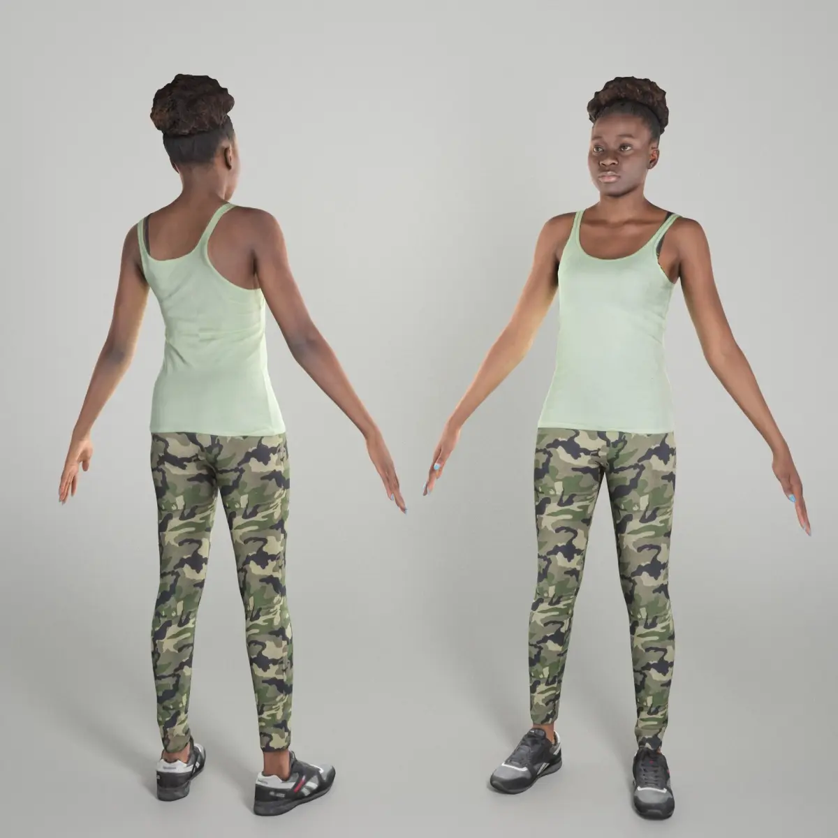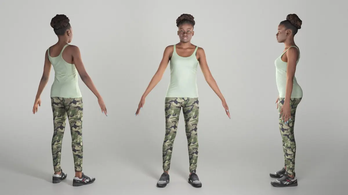 This is a true human size and detailed model of a sporty beautiful young woman of African appearance in sportswear. The model is captured in the A-pose with mesh ready for rigging and animation in all most usable 3d software.