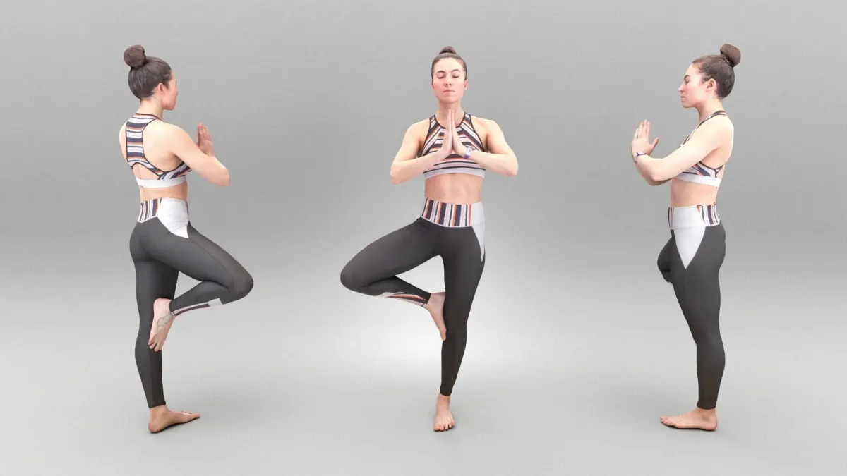 This is a true human size and detailed model of a sporty beautiful woman of Caucasian appearance dressed in sportswear. The model is captured in casual pose to be perfectly matching various architectural and product visualizations, as a background or mid-sized character on a sports ground, gym, beach, park, VR/AR content, etc.