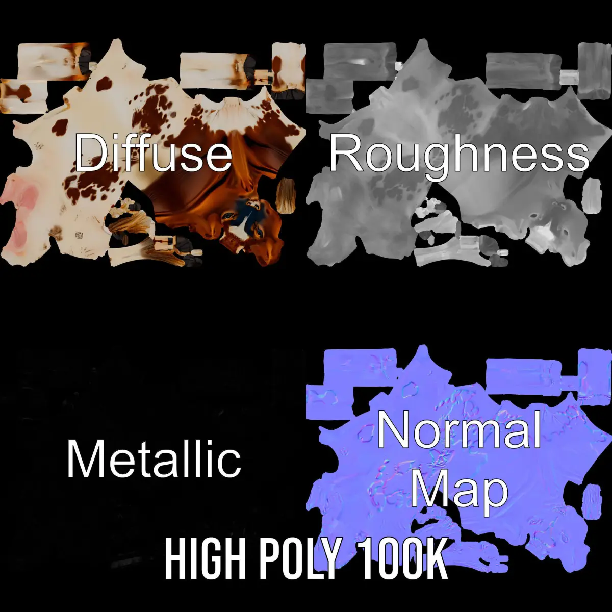 The Spotted Dairy Cow 3D Model Pack offers detailed models in three levels: low-poly, middle-poly, and high-poly, suitable for mobile apps, environment setups, and high-quality rendering, respectively. Perfect for educational simulations, agricultural games, and virtual reality farms, this pack provides versatility with its LOD System. The models come with PBR, Diffuse, NormalMap, and reflection/roughness/metallic textures, all accurately unwrapped with no overlapping UVs, and sized at 4096*4096 for high-quality rendering. The first image is the reference used for creating the 3D model. It is important to carefully evaluate the quality of the model by examining the preview images that display the topology and polygonal mesh. These previews (WIRE and WEB 3D Preview) clearly demonstrate how accurately the model matches the original reference and how well the geometry has been executed. Please like and leave a comment if you enjoyed this model pack.