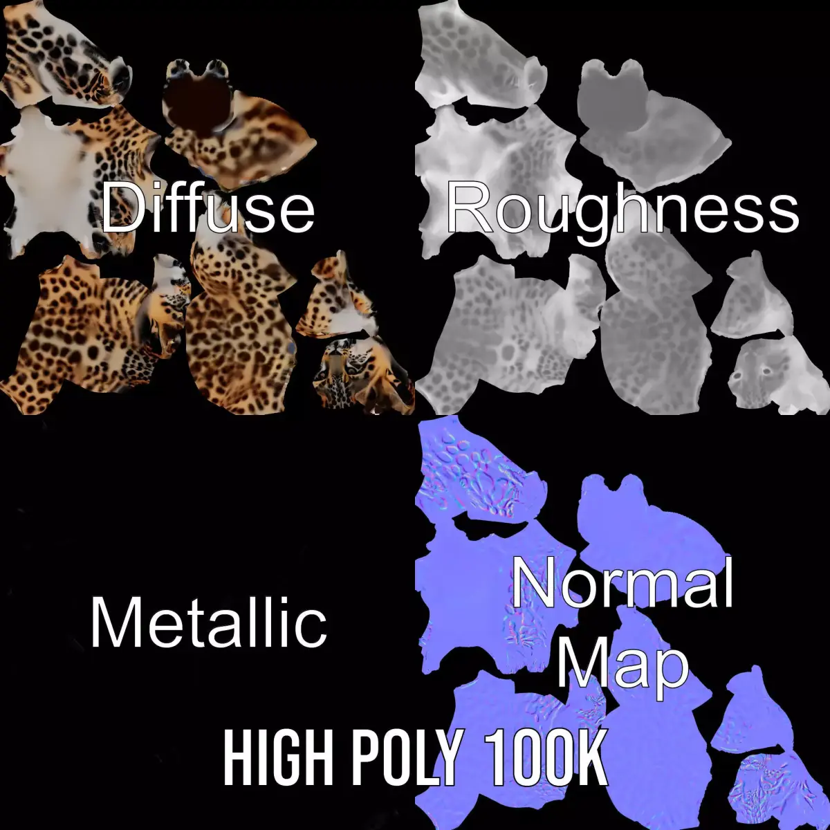 This Spotted Leopard Realistic model pack delivers an intricately detailed 3D model suitable for various applications. Each model has 3 levels of detail: low-poly (1000 triangles for mobile), middle-poly (10,000 triangles for environment), and high-poly (100,000 triangles), which allows for the use of this model in production rendering (such as 3ds Max, Maya, Cinema4D, Blender, Vray/Corona/Cycles and all others), game engines (Unity and Unreal compatible), and interactive presentations, providing a choice of detail based on the LOD system principle. Perfect for wildlife simulations, educational content, and high-end animations, the model stands out with remarkable texturing and realistic appearance. The model's textures are PBR, Diffuse, NormalMap, and reflection/roughness/metallic, which are suitable for any modern rendering engine. All models accurately unwrapped and have no overlapping UV. All textures are 4096*4096 in size. Please like and leave a comment for the model if you enjoyed it.