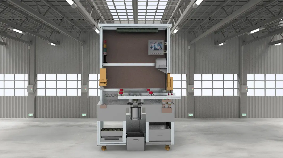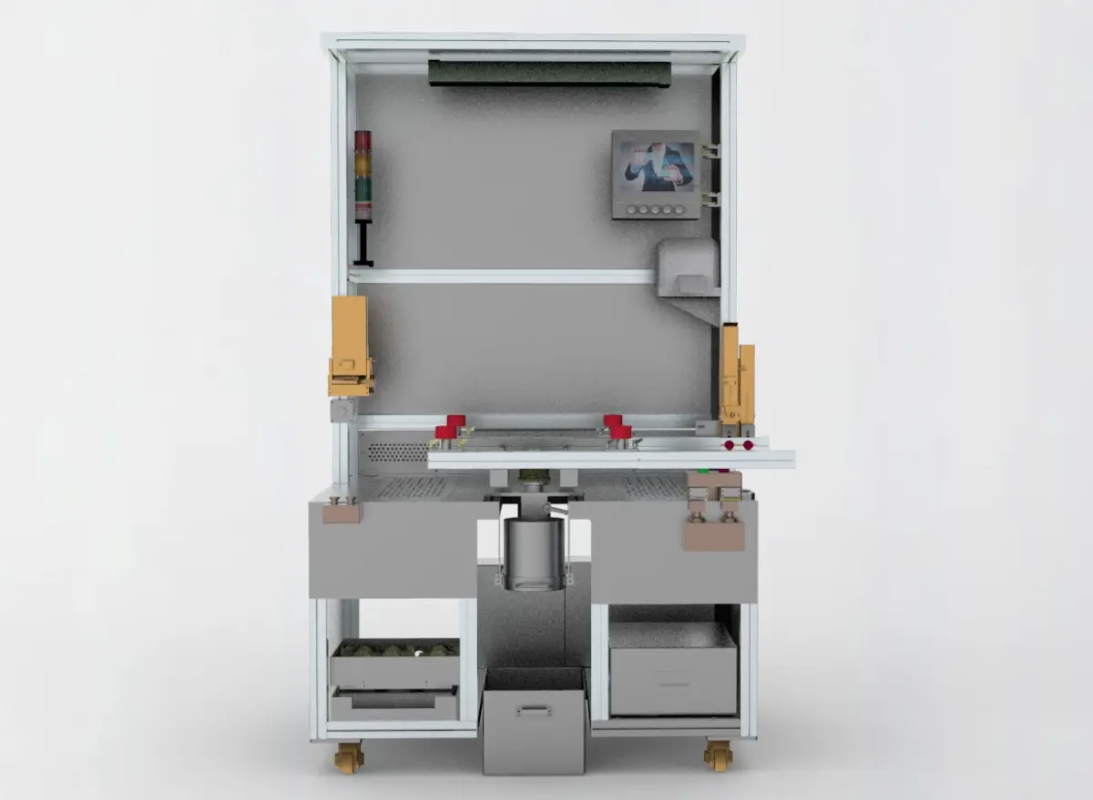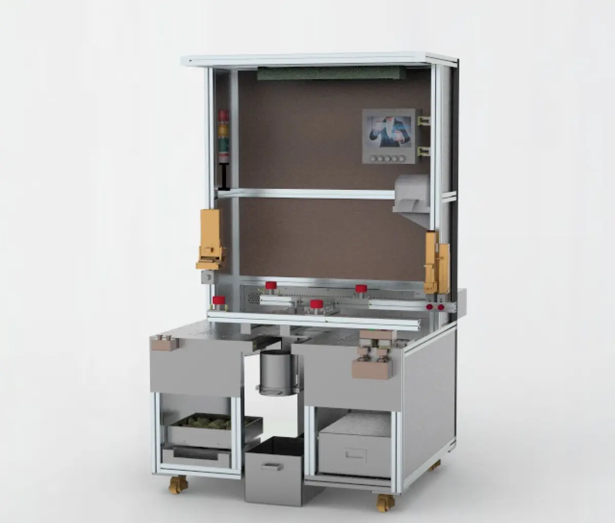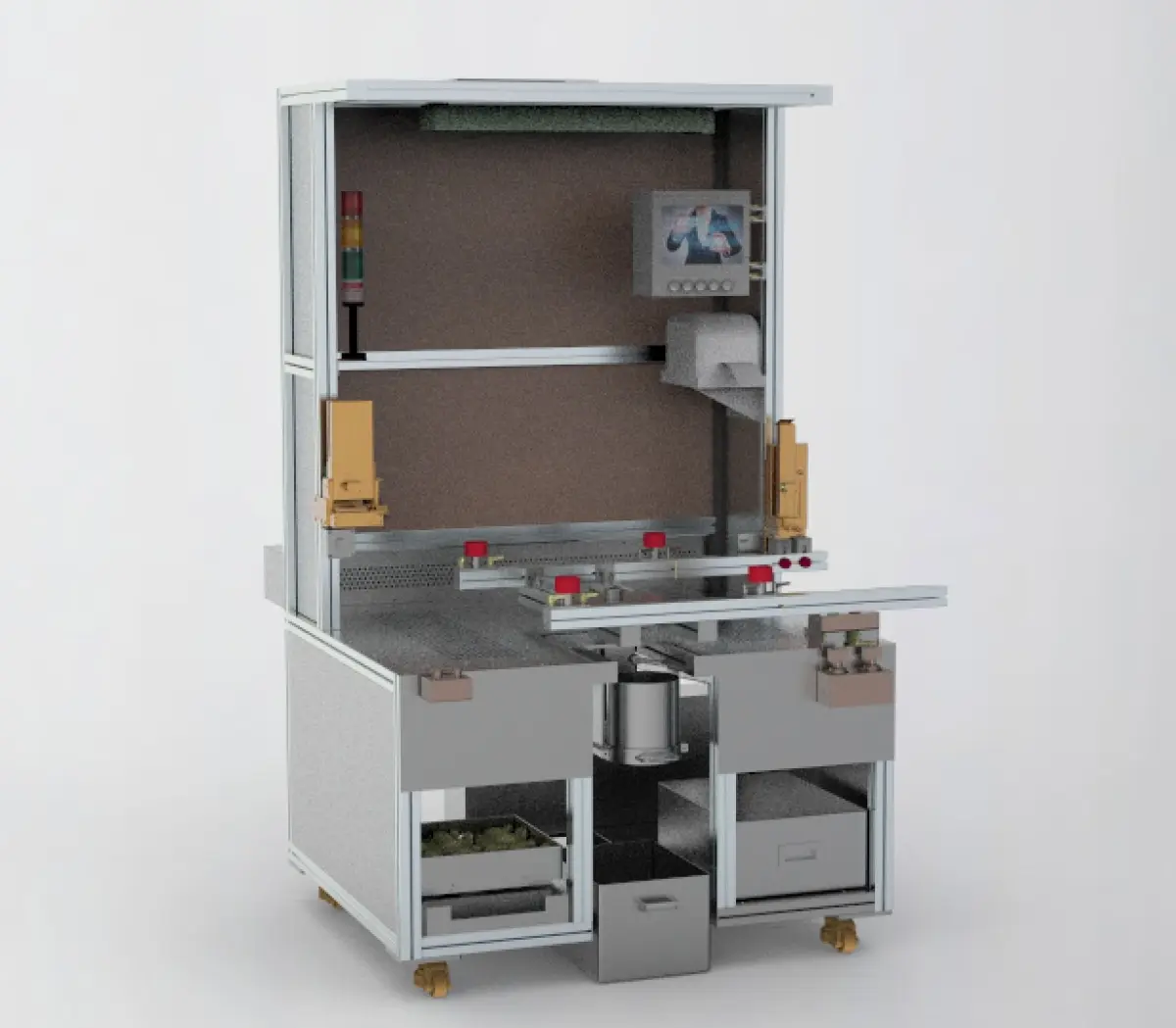 The platform is used for manual spraying of products. Machine setting and process configuration, spray paint tank installation station, self-shaking device, no process operation according to requirements, set switch lock.For example: When no. 1 spray paint can is needed, the switch lock will be opened only after pressing the button, and the operator can take out the can for spray paint operation.At the same time, there are many tooling positions, such as automatic discharge tank device, can automatically take out the tooling tank, automatically use the mechanism of the spring principle of automatic feeding.Although the equipment is manual workbench, but a lot of tooling and Settings are very simple, very reference value, is a good reference template for the design of different types of equipment mechanism.