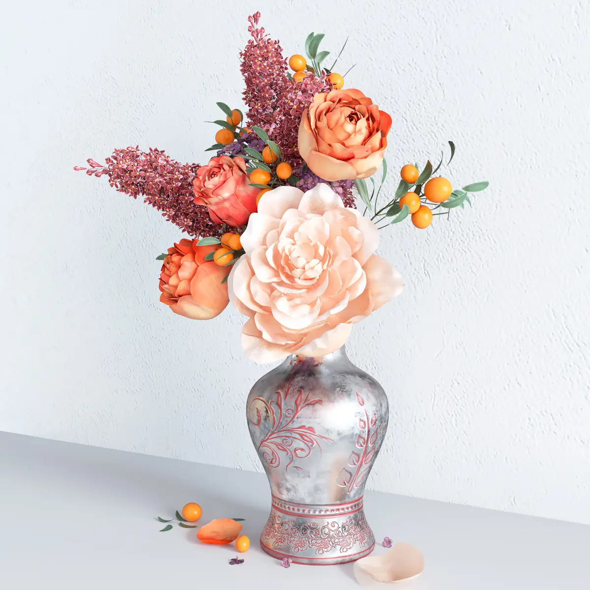 Highly photorealistic model of bright bouquet of lilacs, roses and peonies;