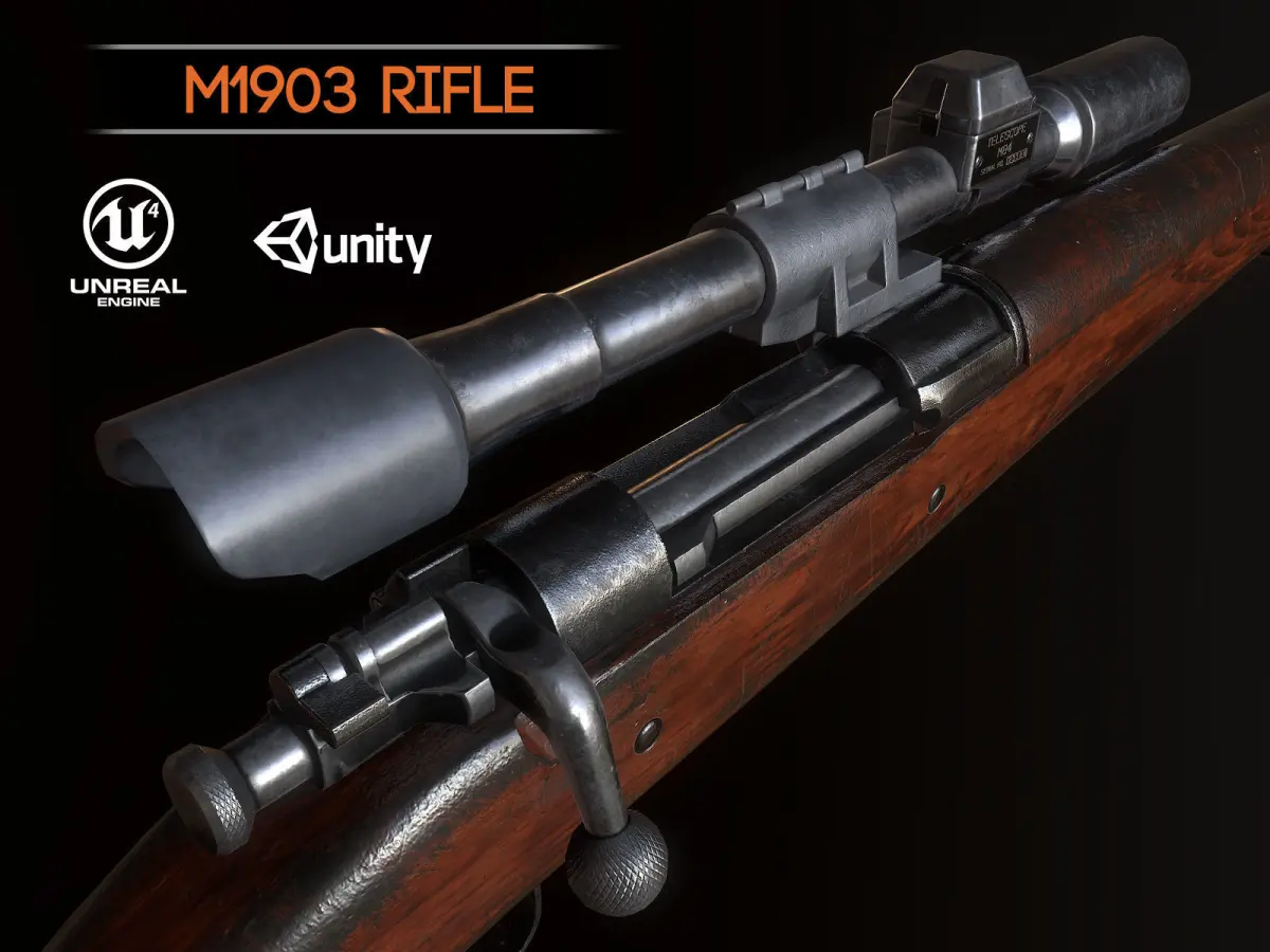 Springfield M1903 Sniper rifle with M84 scope .One uv\material for rifle and one for scope. Lowpoly, optimized for modern game engines. The normal map was baked from a high poly model. Geometry is triangulated to ensure best shading. Model unwrapped manually to make most efficient use of the UV space. High quality 4K resolution PBR png textures. Comes with textures optimized for Unreal Engine 4 and Unity 5.