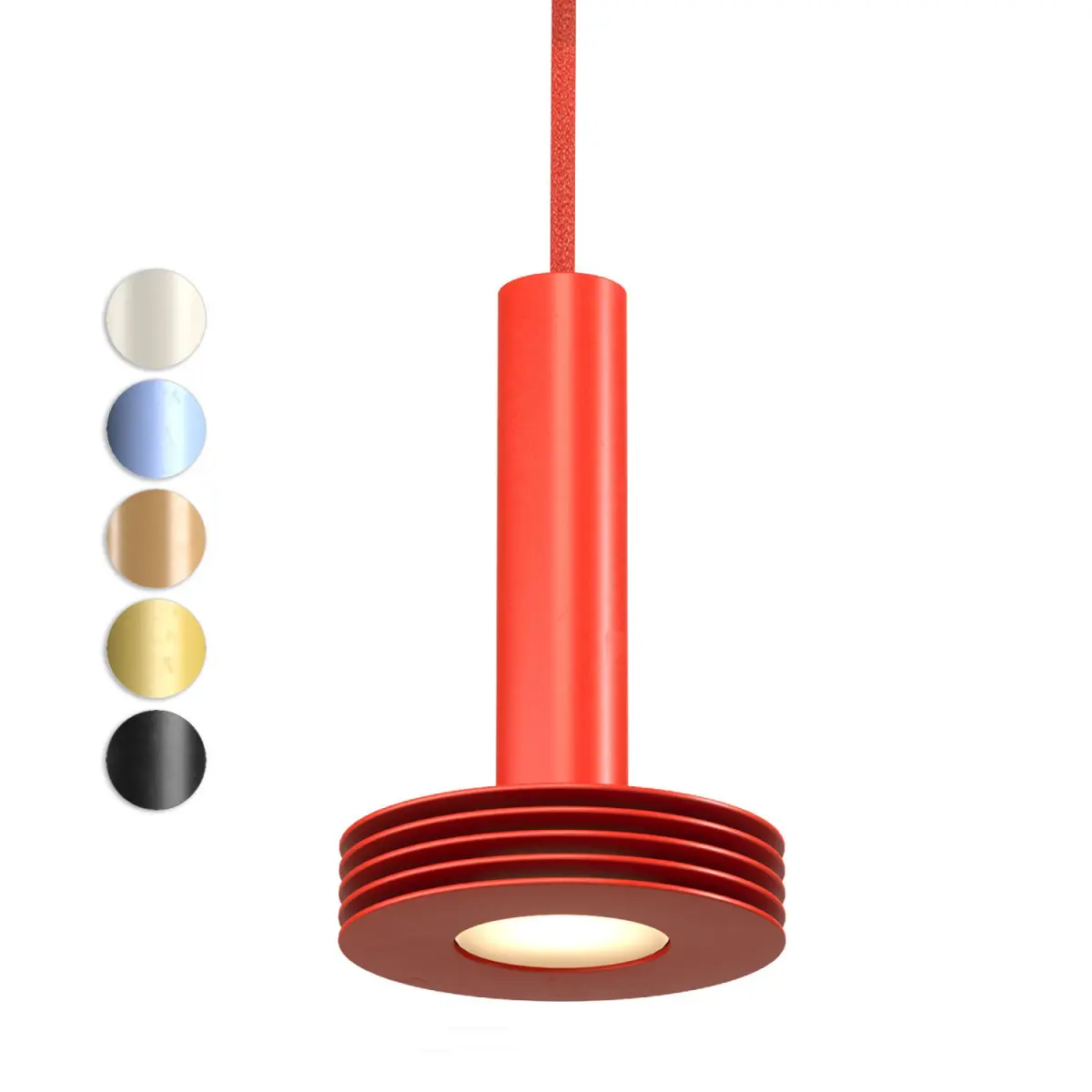 A small pendant light with a distinct geometric silhouette. Upon closer inspection, thin slats are apparent that create transparency, layers and distribute the light.Sprinkle can play the role of the room's leading light, or just as good, act in an ensemble of lights multiplied throughout a larger space; many make the space vibrate with light and colour.The fixtures are available in six specially composed colours; hence the name, which refers to the vibrant cake topping.