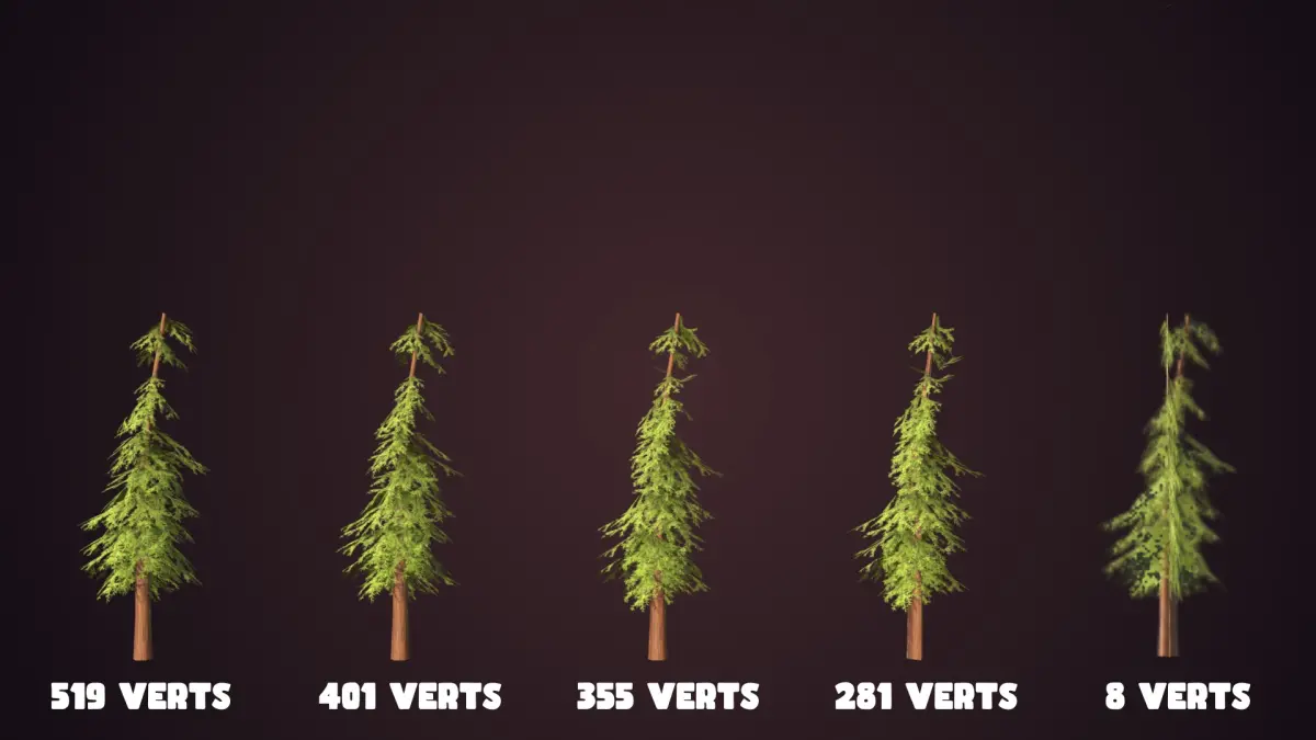 - Trees have LOD0, LOD1, LOD2, LOD3 and LOD4 ( billboard)