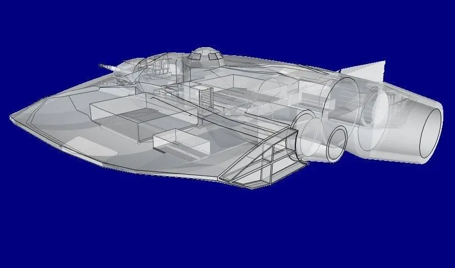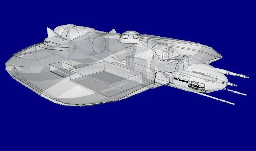 The model is made in Sketchup-2013 (.skp) and then converted to other formats.Combat corvette "Conqueror" is designed to combat enemy objects both in space and on land. May make raids rocket, bomb and torpedo objects on land, sea and air. It can also be used to transport amphibious small groups (up to 10 people) and supports them in combat operations.The basic weapons are 6 different types of laser guns, and conventional cannon and machine guns mounted on two small towers (at both sides of the bow). Replacement equipment (depending commissioned the task) is mounted in the cargo box under the plating of the spaceship. The boxes can be mounted cargo: 4 drones "XW483 Phalanga-XN" or 2 drones "XW483 Phalange-XM" ("XW482 Phalange-XL", "XW481 Harpoon") or 8 bombs. In addition, the bottom can be mounted 6 missiles "AGM-84E Harpoon".Corvette on land rests on six telescopic tripod. The displacement of the vessel (e.g., a hangar) foot stands sling so that the vessel is deposited on the wheels. Wheels serve only to move the ship because corvette takes off and lands vertically.The ship's crew is 2 to 4 persons (including two people to operate and control drones). Together with a landing group of ship carrying up to 14 people.The total length of 29 meters (27 meters unarmed at the bow of the ship(.