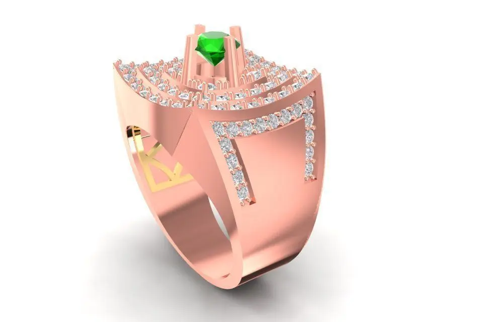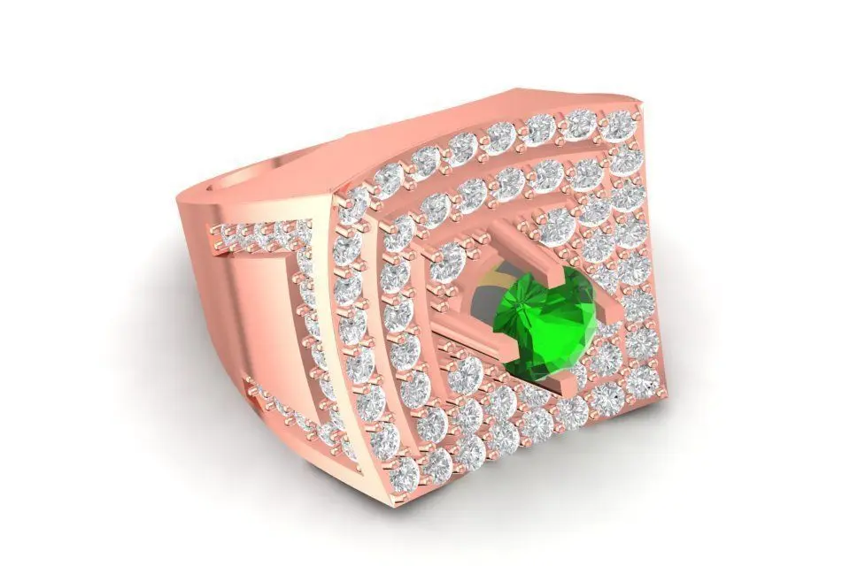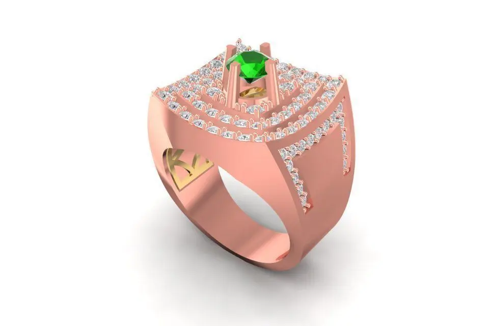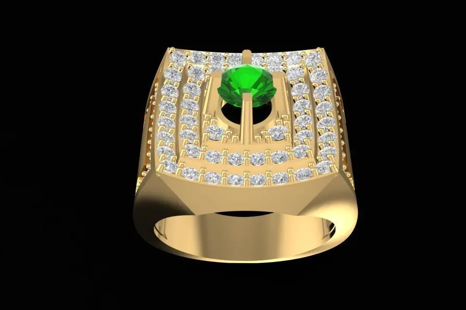 This 3D model is a square emerald diamond gold men ring with a bold and luxurious design. The centerpiece features a brilliant green emerald set on a raised square platform, surrounded by multiple rows of sparkling diamonds arranged in a stepped layout. The wide shank and strong structure emphasize masculinity and power, making it an ideal statement ring for men.
