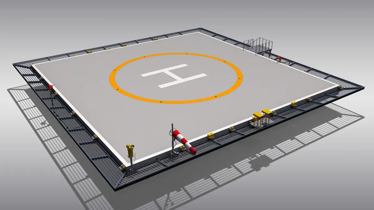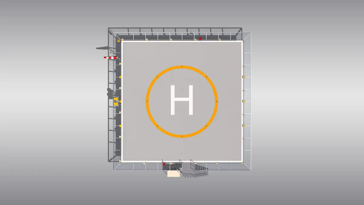 Detailed 3D model of a fully equipped square heliport, modeled and rendered in Cinema 4D. The model was created using approximate real world dimensions. The model includes an oscillating fire monitor, bladdertank, elevated perimeter light, inset light, floodlight, CHAPI unit and a wind sock