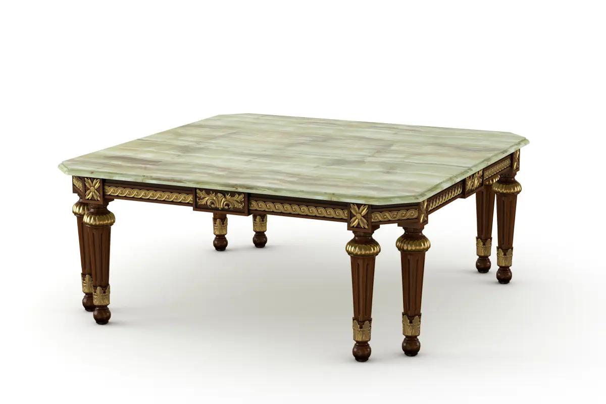 A decorative complementary item that will make the difference, this square coffee table is not for everyone. Green beveled onyx, empire-style legs and walnut finish with gold leaf applications all over the carvings. So many secret details you can spend a night counting them. Modenese Furniture can also offer matching armchairs, sofas and tables.