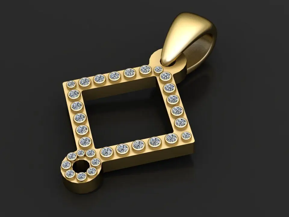 This modern and sleek pendant design features a geometric square frame accented with an extended circular detail at one corner, creating a unique, contemporary silhouette. The entire border of the square is studded with dazzling round-cut gemstones, providing an eye-catching sparkle that enhances its minimalistic yet luxurious aesthetic. Available in two elegant finishes—polished gold and pristine silver—this pendant is perfect for those who appreciate bold shapes, symmetry, and a clean design with a touch of brilliance. Ideal for both casual and upscale styling, it's a standout piece for fashion-forward wearers.