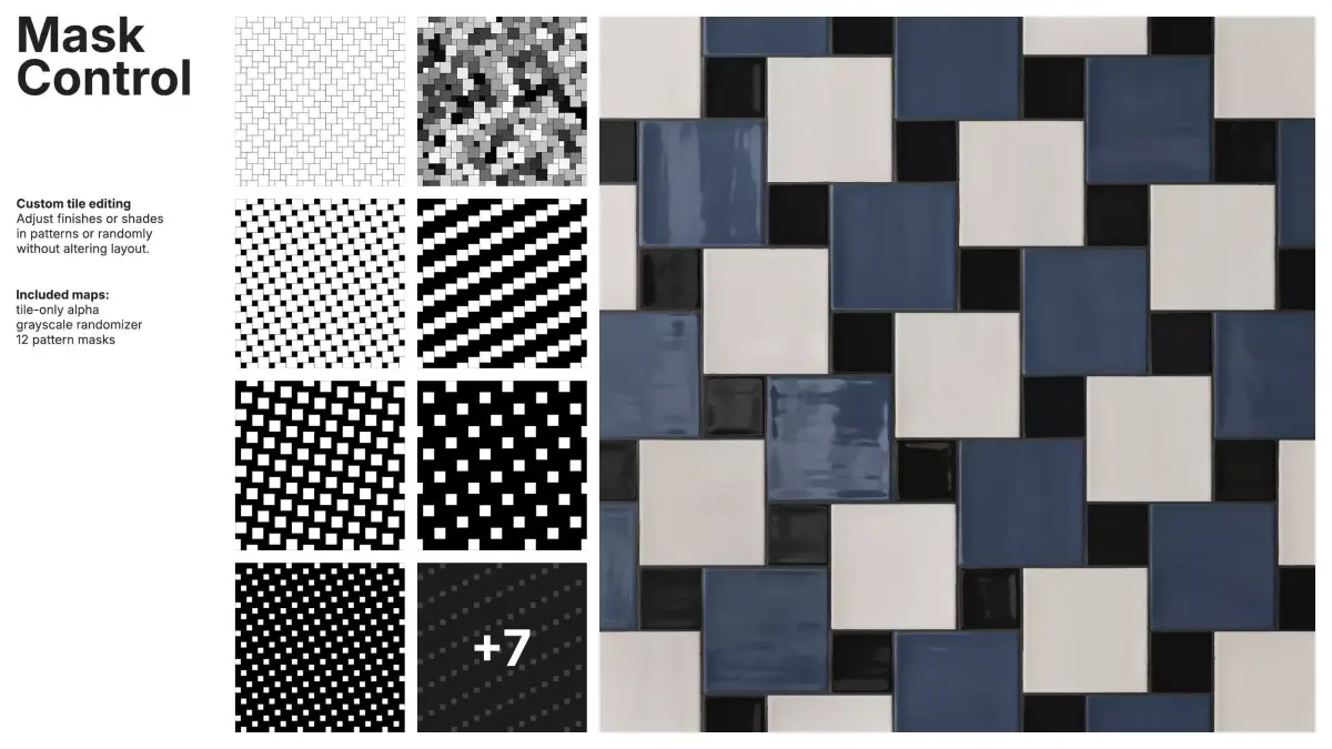 Pattern and random masks allow independent control of tile and grout colors, enabling global, per-pattern or per-tile adjustments without disturbing the layout. Tile-only alpha, a grayscale randomizer and pattern masks ensure full customization for complex designs.
