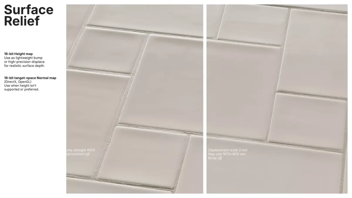 Surface relief is provided by a RAW 16-bit height map tuned for a true 3 mm depth (2340x2340 mm surface), suitable for lightweight bump or precise displacement. A 16-bit tangent-space normal map (DirectX/OpenGL) is included for cases where height-based workflows aren’t preferred.