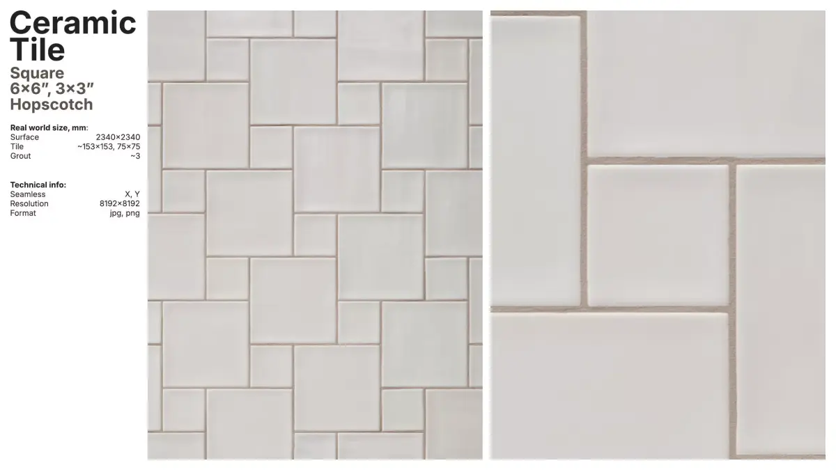 Glazed artisan ceramic tile material in a square 6x6, 3×3 format arranged in a hopscotch layout.