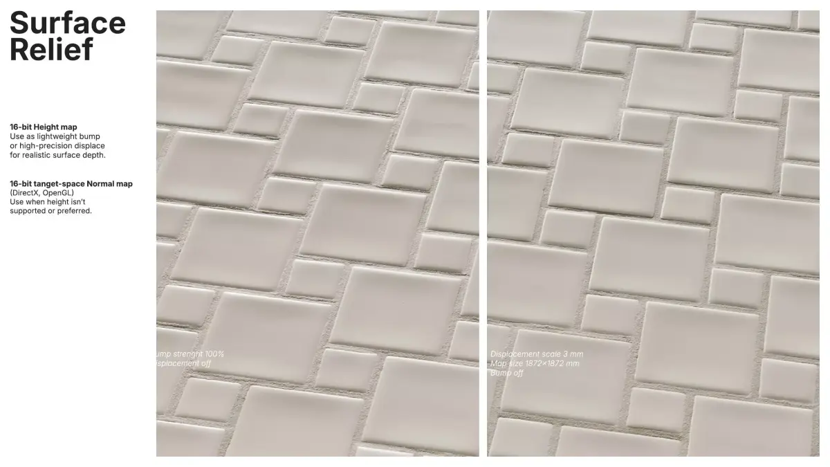 Surface relief is provided by a RAW 16-bit height map tuned for a true 3 mm depth (1820x1820mm surface), suitable for lightweight bump or precise displacement. A 16-bit tangent-space normal map (DirectX/OpenGL) is included for cases where height-based workflows aren’t preferred.