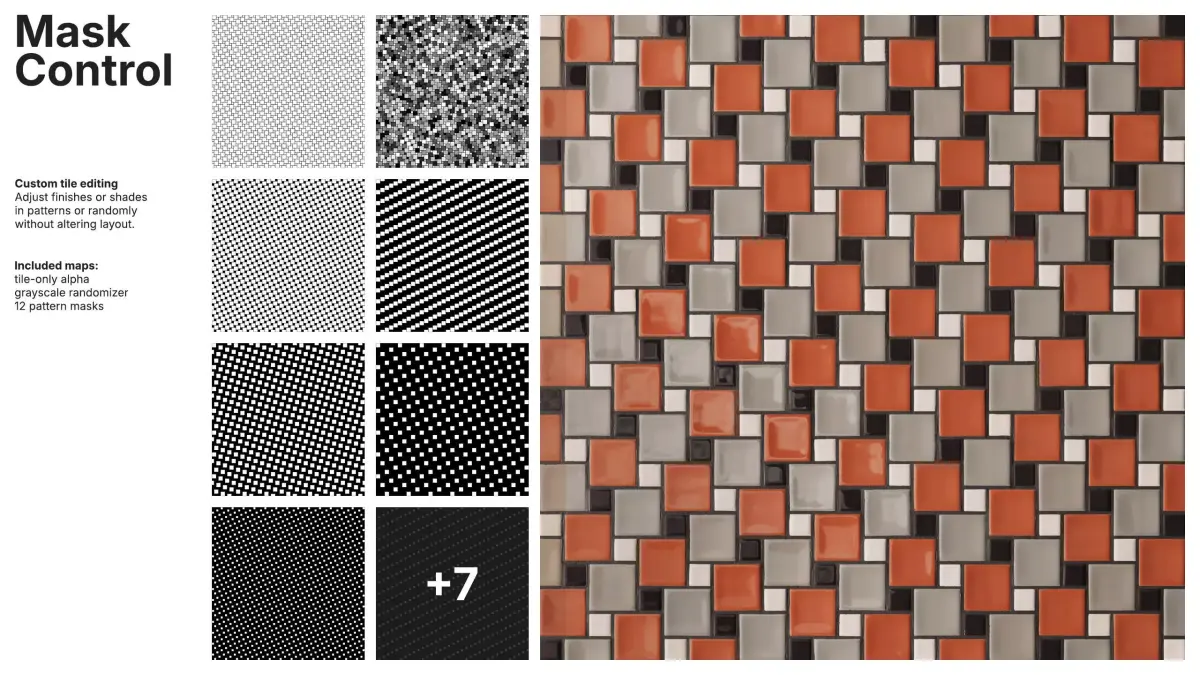 Pattern and random masks allow independent control of tile and grout colors, enabling global, per-pattern or per-tile adjustments without disturbing the layout. Tile-only alpha, a grayscale randomizer and pattern masks ensure full customization for complex designs.