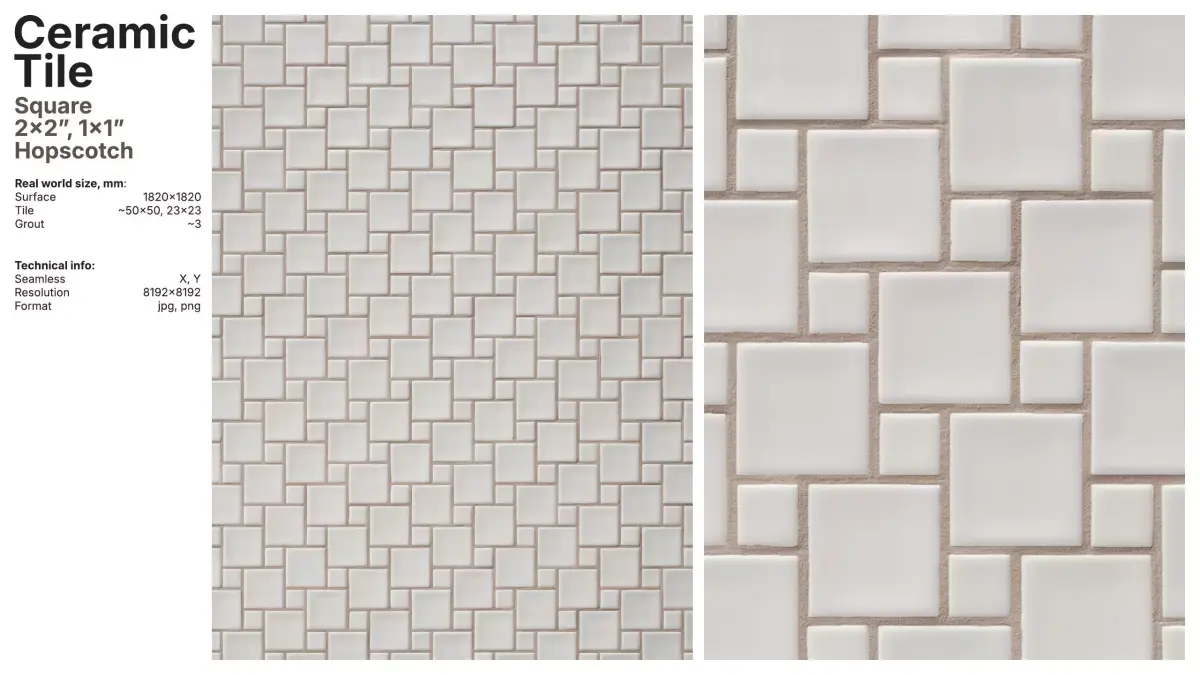 The package includes 8 diffuse variations with matching grout tones, and a flexible color base that works out-of-the-box or as a starting point for custom looks.
