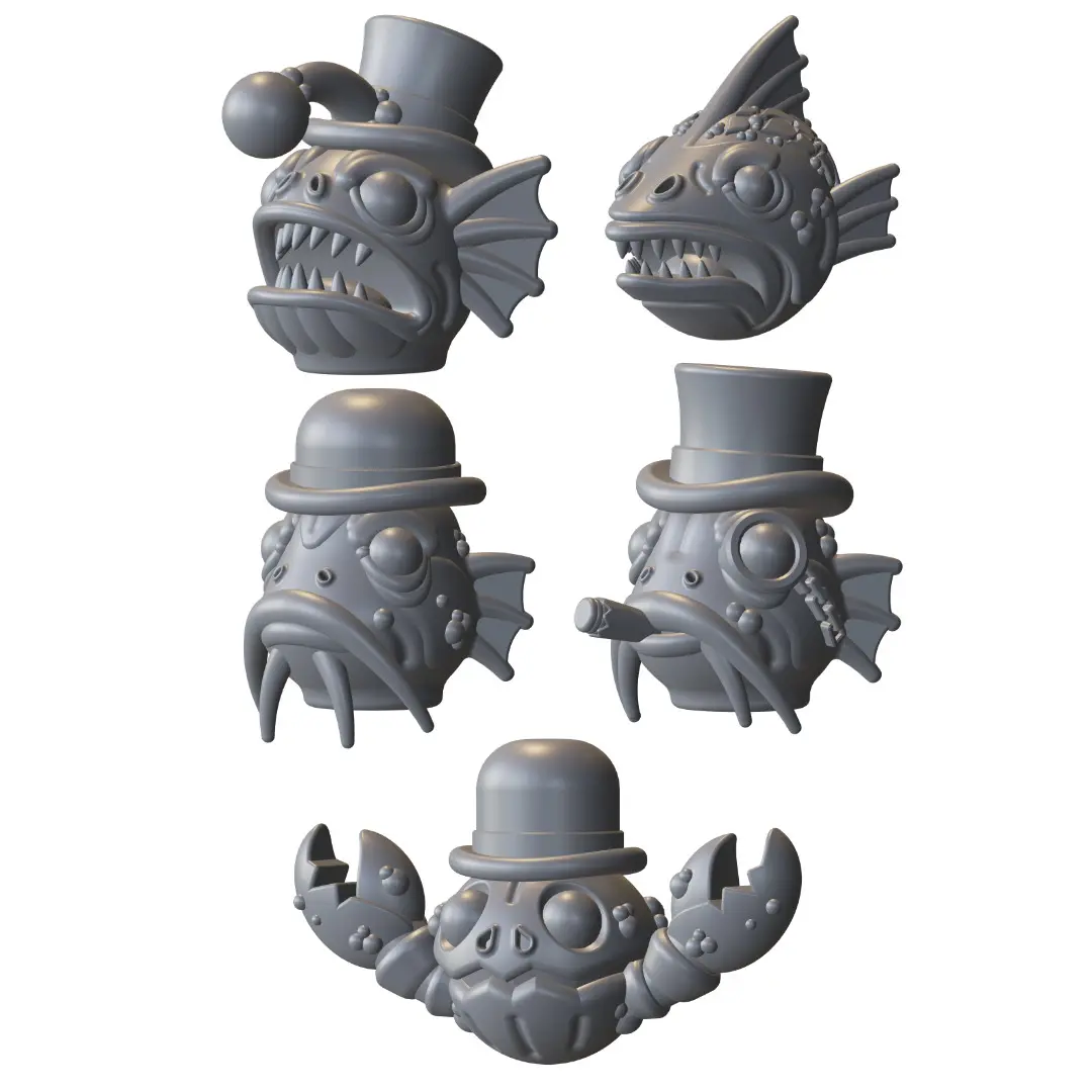 Avast, ye scurvy hobbyists! The Squelchy Fish Pirate Kitbashing Bits are here to plunder your plastic pile! This quirky set of 32mm scale heads and basing bits lets you turn your tabletop miniatures into deep-sea scallywags with barnacle-crusted charm and aristocratic flair.
