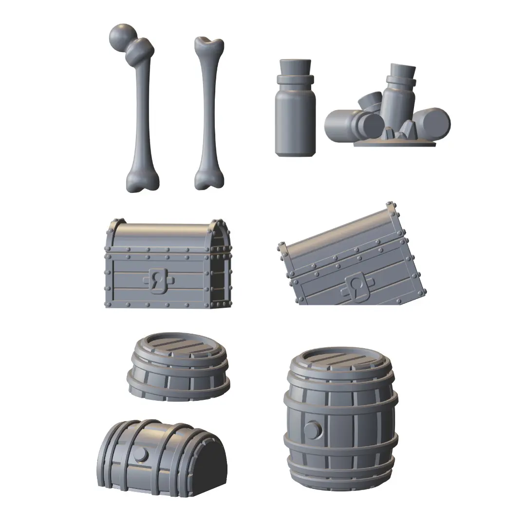 Nautical basing bits like treasure chests, barrels, bones, and bottles