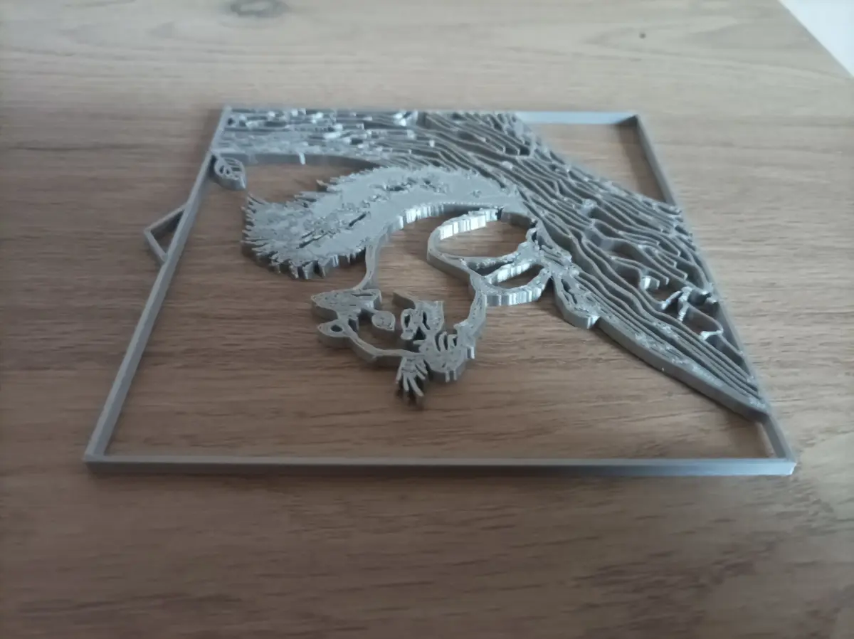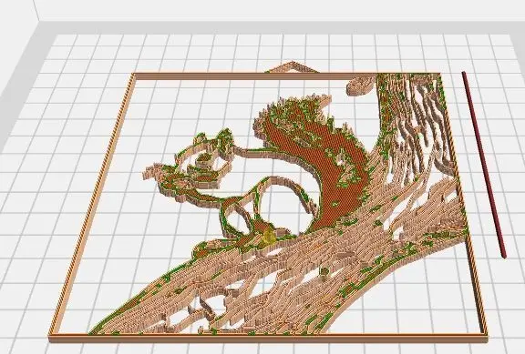 The model features a squirrel sitting on a branch of tree, eating nuts, embedded in a frame. It was planned to be either a decoration mounted on the wall (if stretched still remains detailed), or a smaller ornament that can be hanged on a thread, or mounted onto a flat surface.