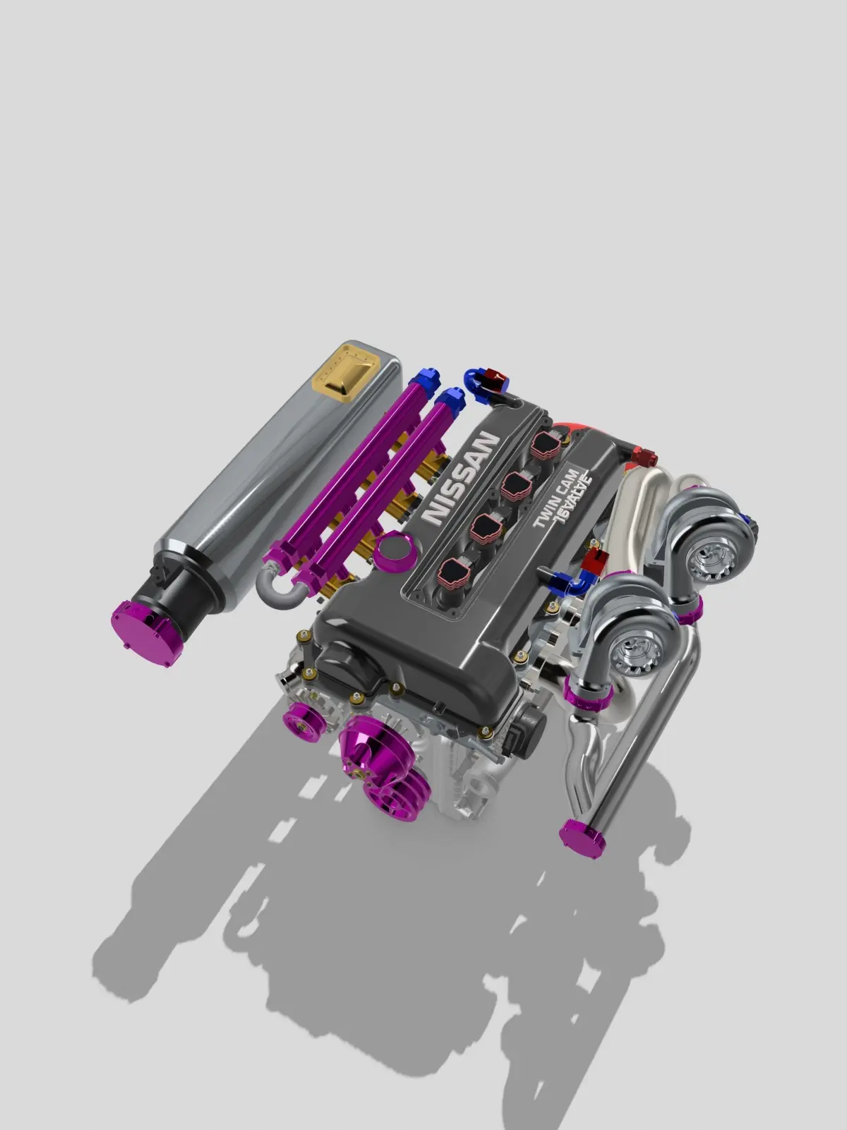 Designed from scratch is a Nissan SR20 engine, with several configurations to suit your build, high in detail, ideal for scale modeling (currently in 1/24 and 1/25 scale).