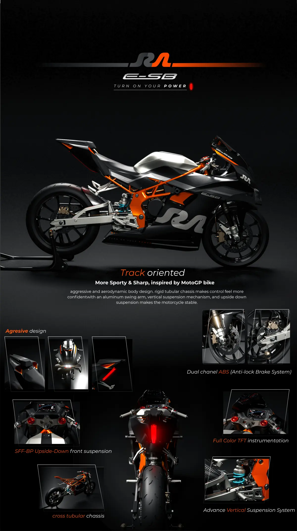 The design of this sport bike is inspired by electric vehicle in indonesia or even in the world rn dominated by small motorbike, scooter shape, not many are in the form of sport bike.So I tried to design electric vehicle in the form of a sport bike with performance oriented parts