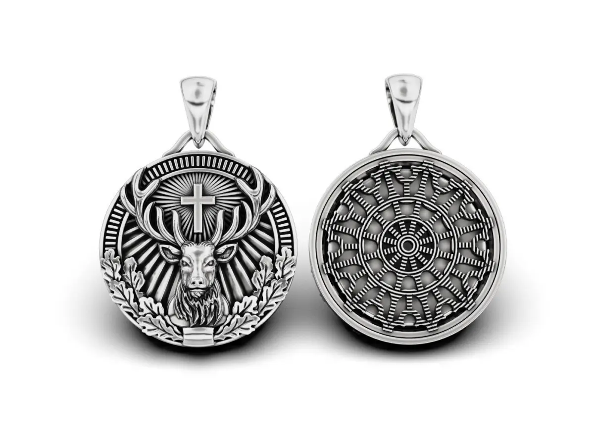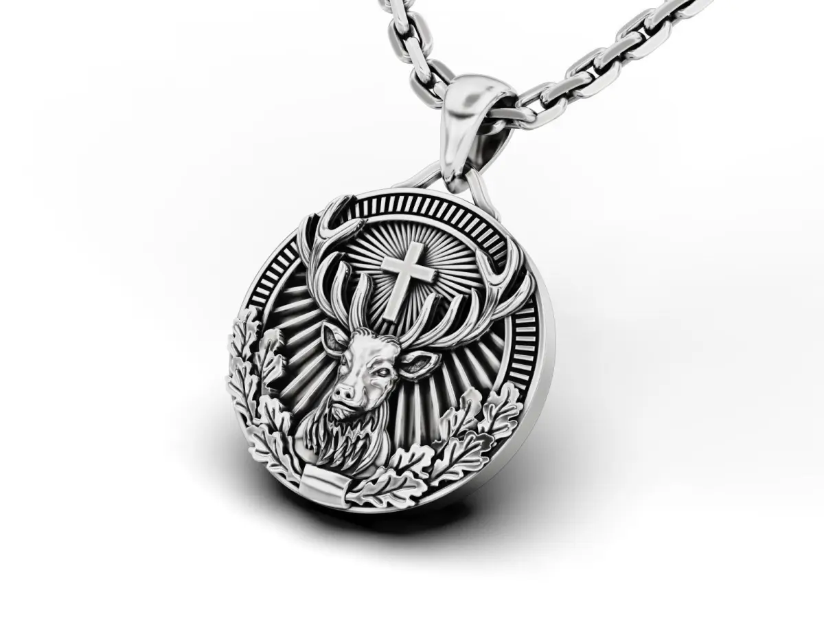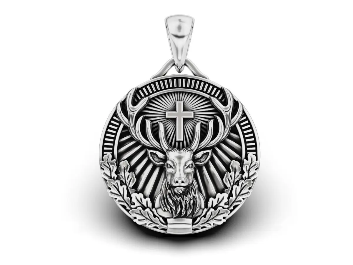 Discover this St. Hubertus pendant, a masterfully detailed 3D model inspired by medieval hunting traditions. The design features a majestic stag with a cross, surrounded by intricate oak leaves and radiant background elements. This STL file is perfect for professional gold and silver casting, making it an ideal piece for hunters, nature lovers, and fans of symbolic jewelry.