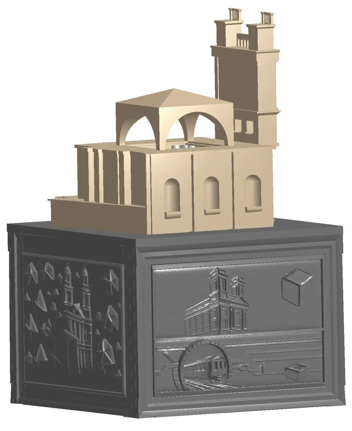Architectural model of St Mary Woolnoth, a church located in the city of London, opposite Bank. I've designed the model to be an exact replica of the church, and I designed a base for the miniature church to be displayed on. The base contains 4 3D printed relief engravings which show the history and key events the church has been through. I then integrated 2 lamp posts into the model to provide lighting and making it even more aesthetically pleasing.