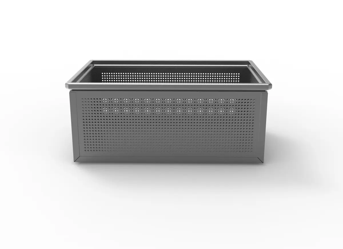 Stackable Steel Box:The model is a stackable steel box from the industrial sector. The box has two handles for carrying and holes on the side surfaces.