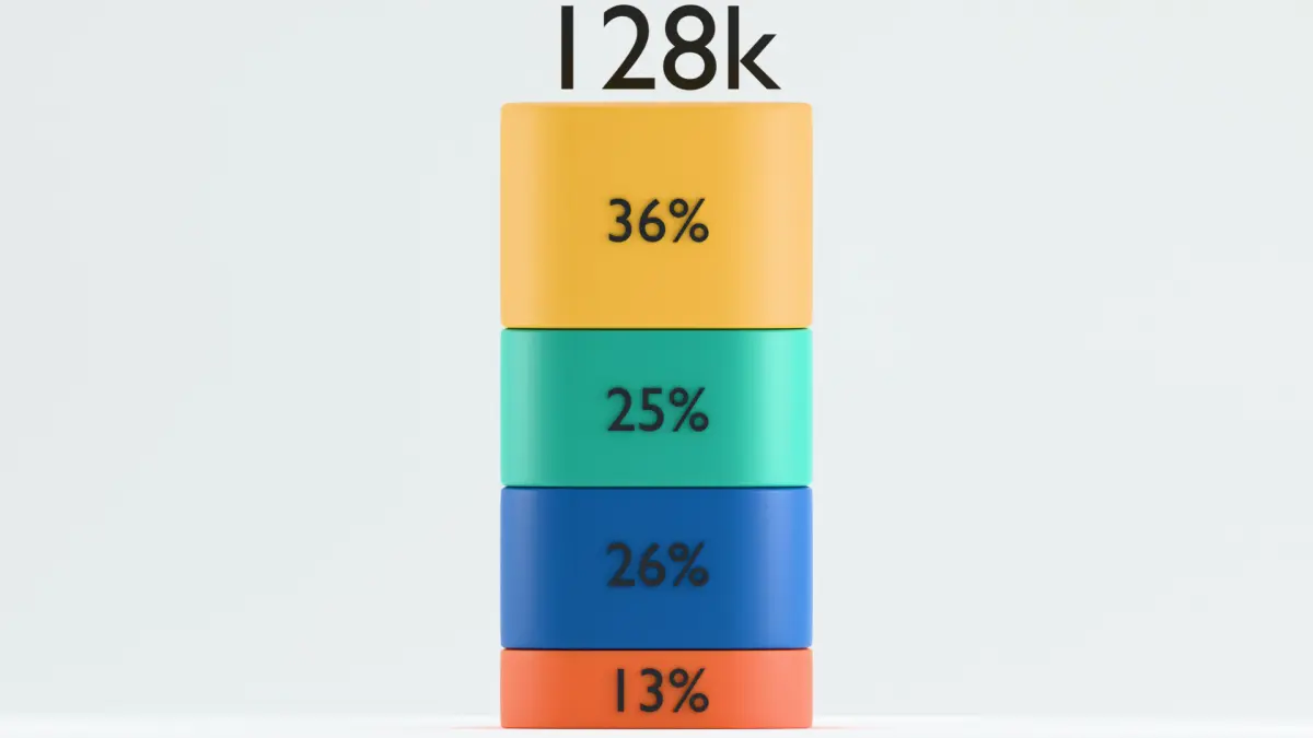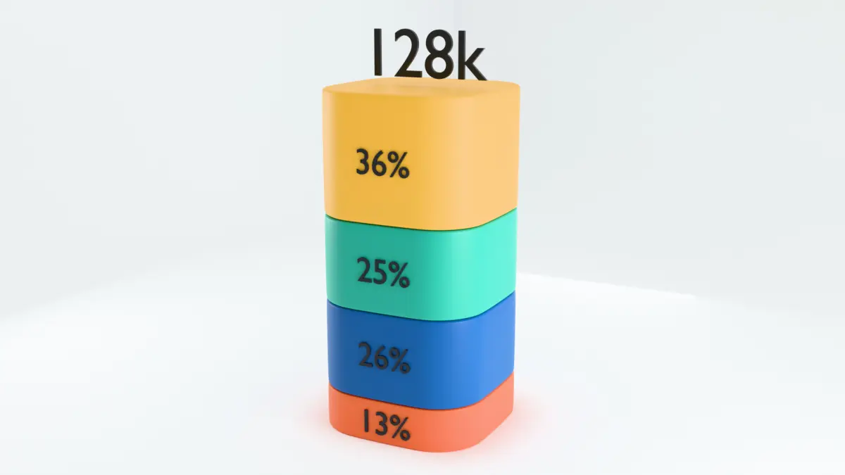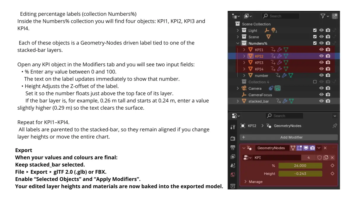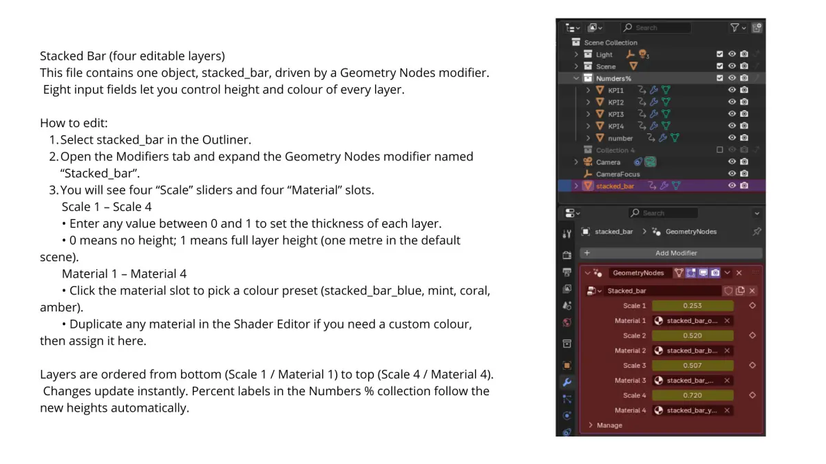 This asset contains a single stacked bar composed of four colour-coded layers . Layer heights are controlled by four float inputs inside one Geometry Nodes modifier; colours can be switched in exposed material slots. Percentage labels are parented to each layer and rise automatically with the growth animation. The scene includes an orthographic camera, three-light setup and transparent-ready render settings. Export to GLB or FBX by applying the modifier-edited heights and colours bake into the mesh.