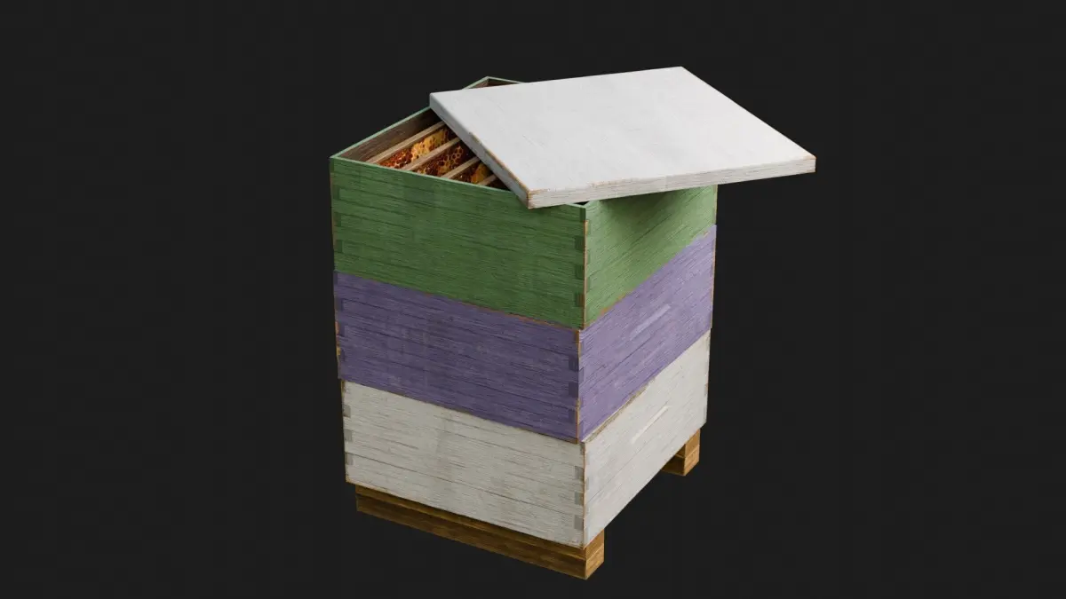 This Stacked beehive model is a realistic and detailed model perfect for closeups, interiors, etc. the model is viewable from all angles and distances as well as from the inside. The mesh comes with 3 Langstroth style boxes stacked on top of eachother on a wooden stand made of 2x4s, a lid, and 6 honeycomb frames. 4 of which are unique and 2 duplicateed. The honey comb frames are highly detailed and can be removed from the frames if necessary. The mesh is UV Unwrapped with vertex colors.