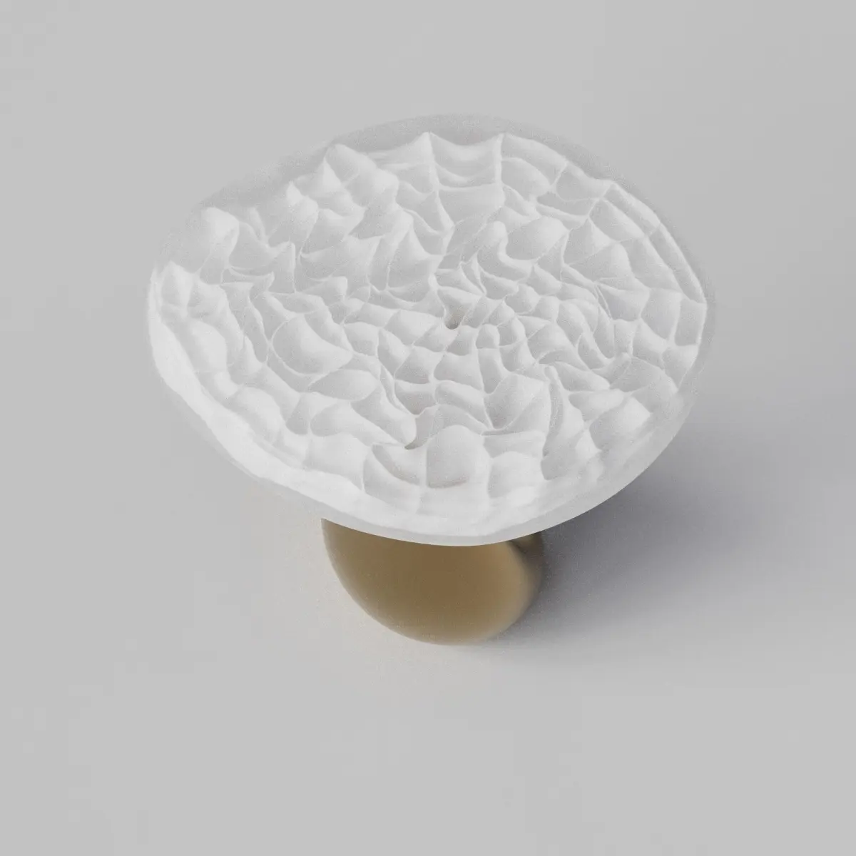 The Mura side table was created in collaboration with Toronto-based glass design and fabrication atelier, Goodman Studio (GS). It pairs STACKLAB’s signature solid-bronze Jupiter leg castings with a triangular or droplet-shaped top of kiln-fused glass. The table’s name derives from the Japanese word for “unevenness, irregularity, inequality.”