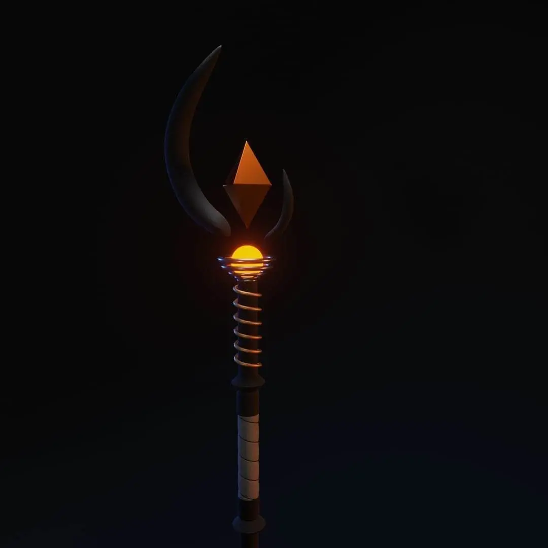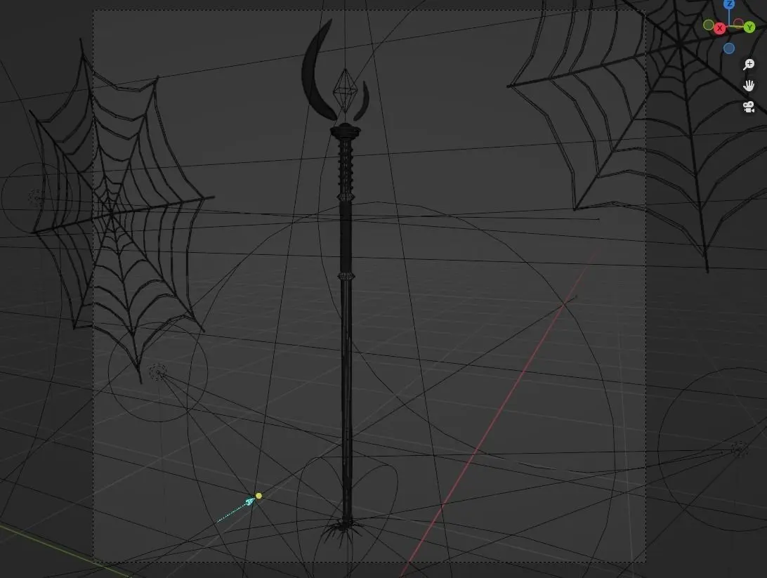 Staff, with a crystal on top, golden details, a spider, cobwebs on the background.